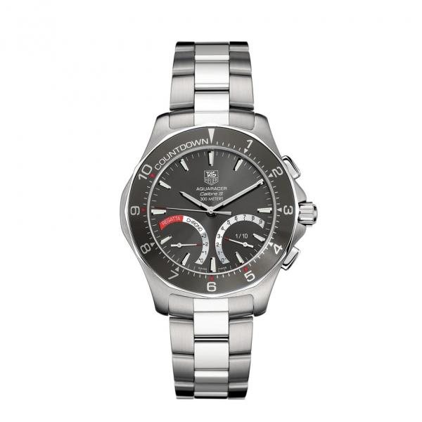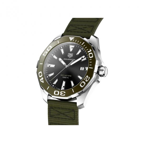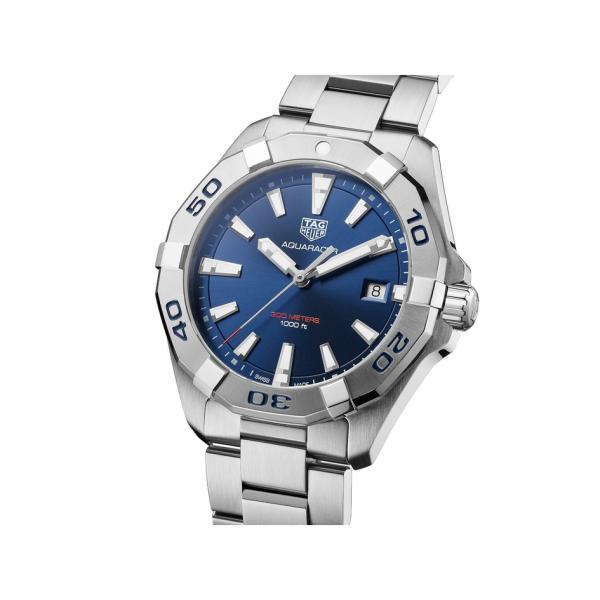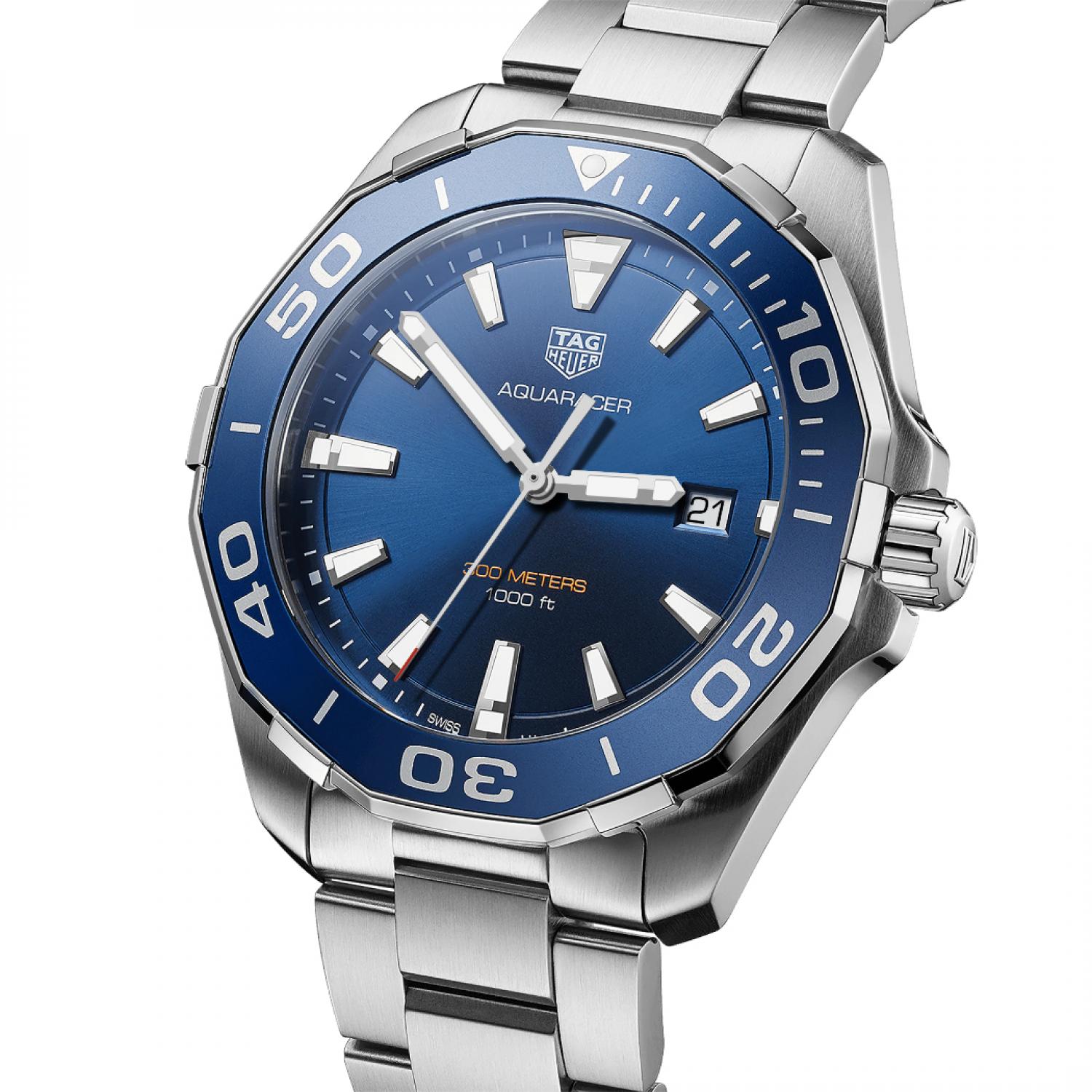 An extremely robust professional dive watch with a 43mm steel case and a Swiss-Made quartz movement. The eye-catching blue of the dial and 60-minute scale unidirectional turning bezel and flange is an Aquaracer signature, as is the orange on the central hand. Water resistance: 300 meters.