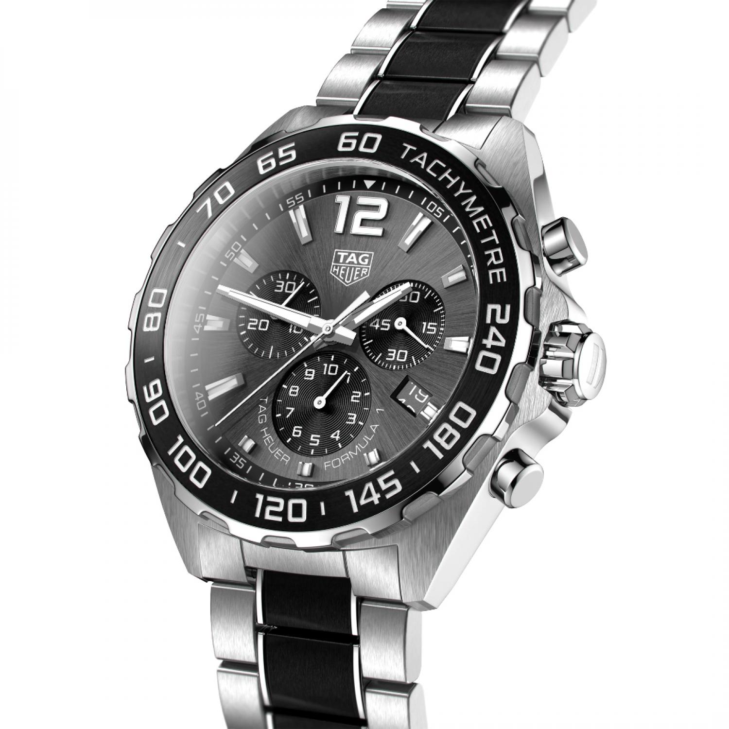 Silver grey dial with luminescent markers, fixed ceramic bezel with tachymeter scale, 200-meter water resistance: a precision-driven chronograph inspired by TAG Heuer’s ongoing commitment to Formula One racing.