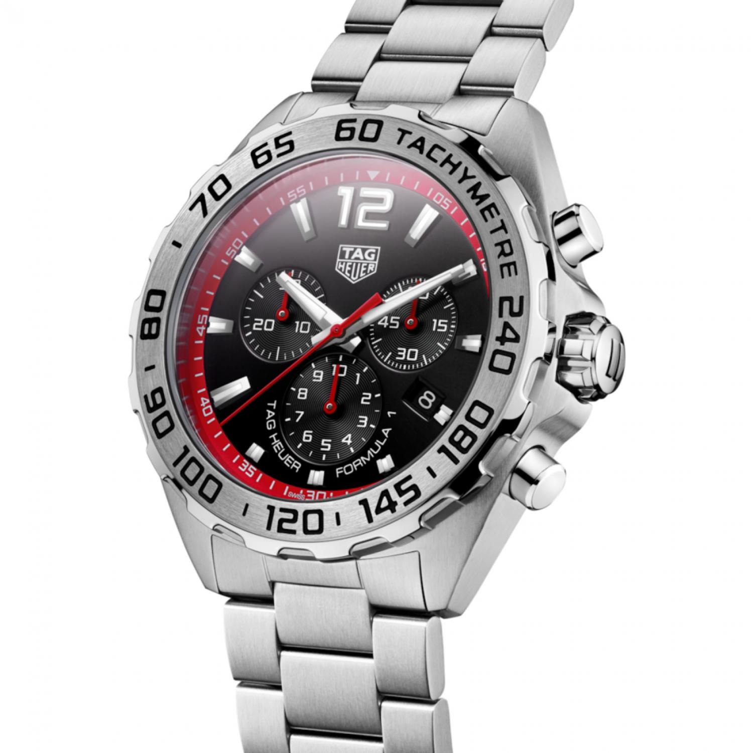 A rugged men’s watch with full racing-chronograph features on a brushed black dial. Red flange and red details, rhodium plating and Super-LumiNova® enhance readability at top speeds and low light conditions.