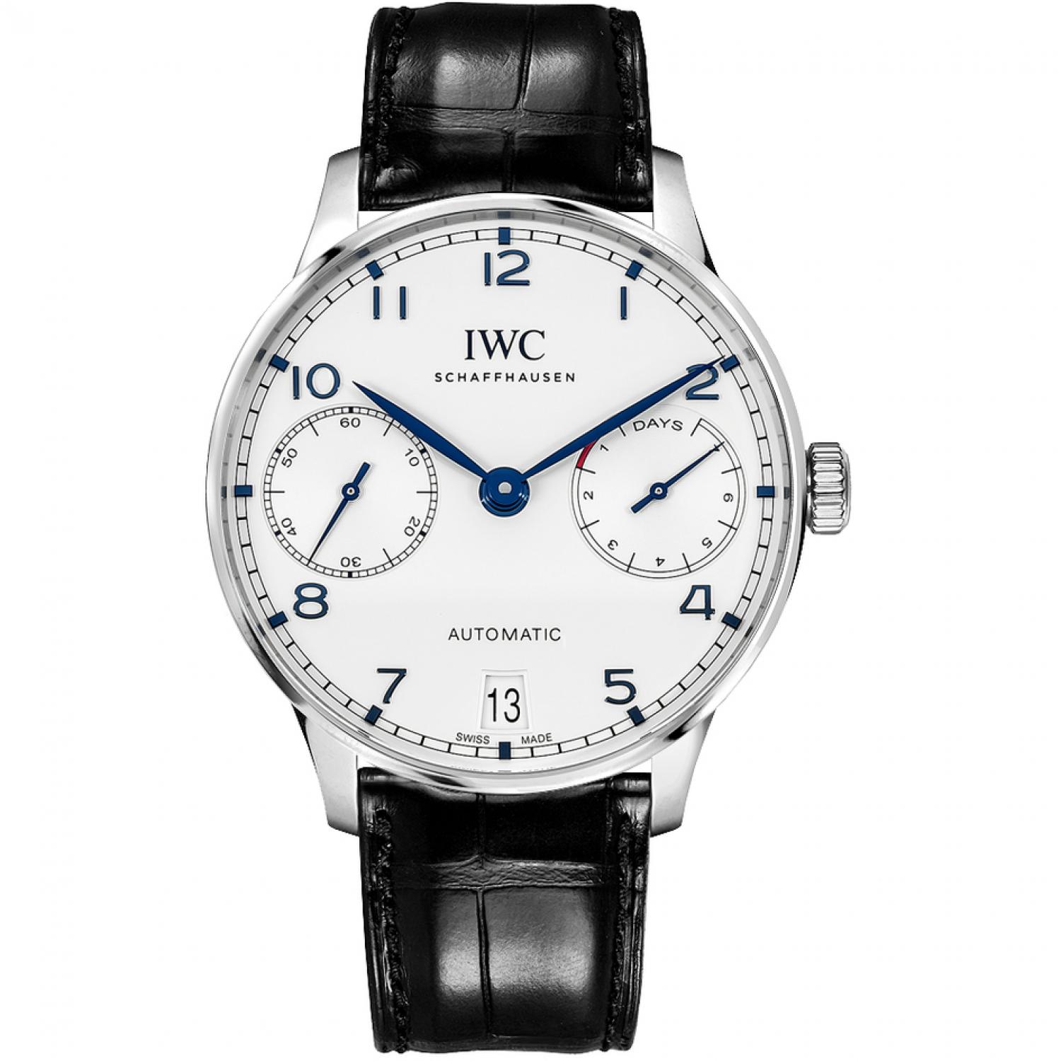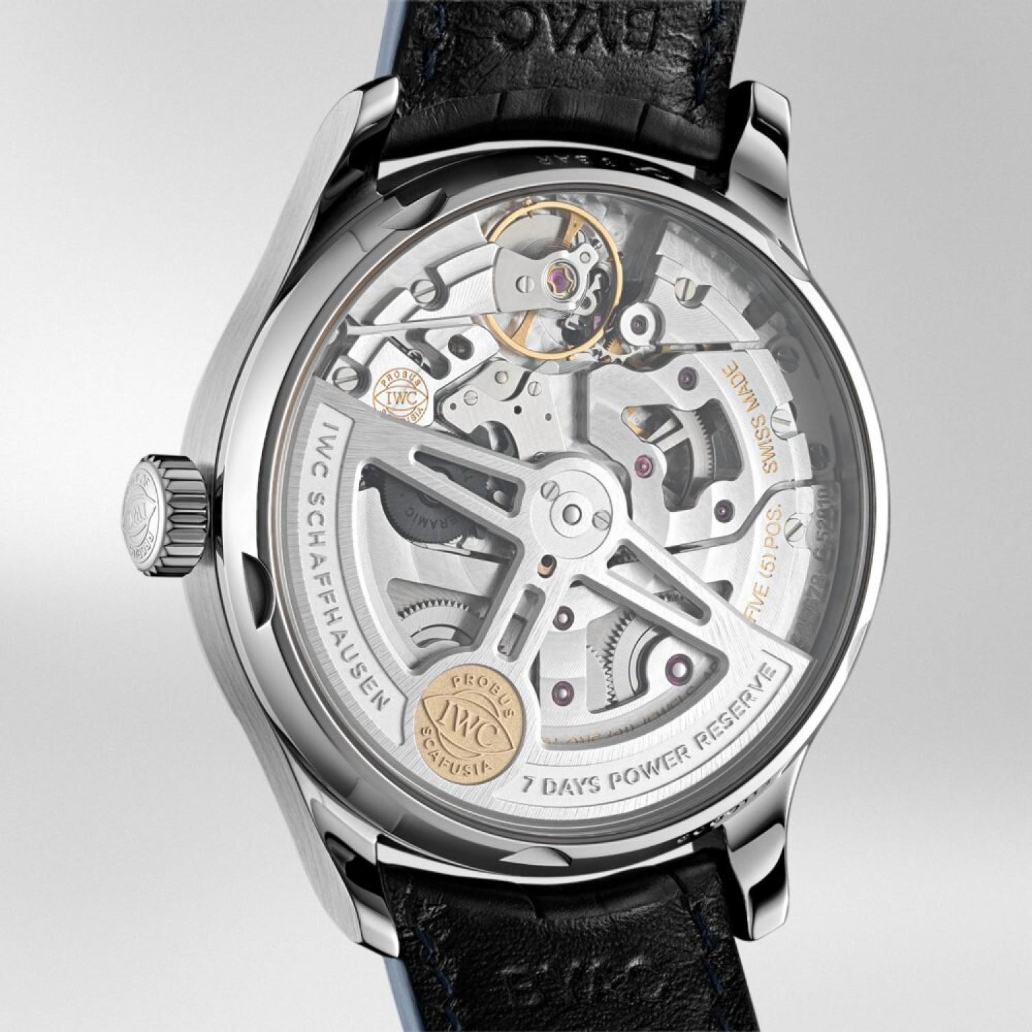 The Portugieser Automatic has become one of the most successful Portugieser models ever to be produced in Schaffhausen. The balanced dial design retains the classic appeal of the legendary original Portugieser first manufactured in the 1930s. The pawls, automatic wheel and rotor bearing in the legendary Pellaton winding system are made from extremely wear-resistant ceramic, while two barrels build up an impressive 7-day power reserve. The ergonomically optimized strap horns ensure greater comfort even on slimmer wrists. The Portugieser Automatic is available with a 42.3-millimetre stainless-steel case, silver-plated dial and blue hands and appliqués. Thanks to the slimmed-down rotor, a glance through the transparent sapphire-glass back reveals even more details of the IWC-manufactured 52010-calibre, such as the black ceramic pawls in the winding system or the Geneva stripe decoration.