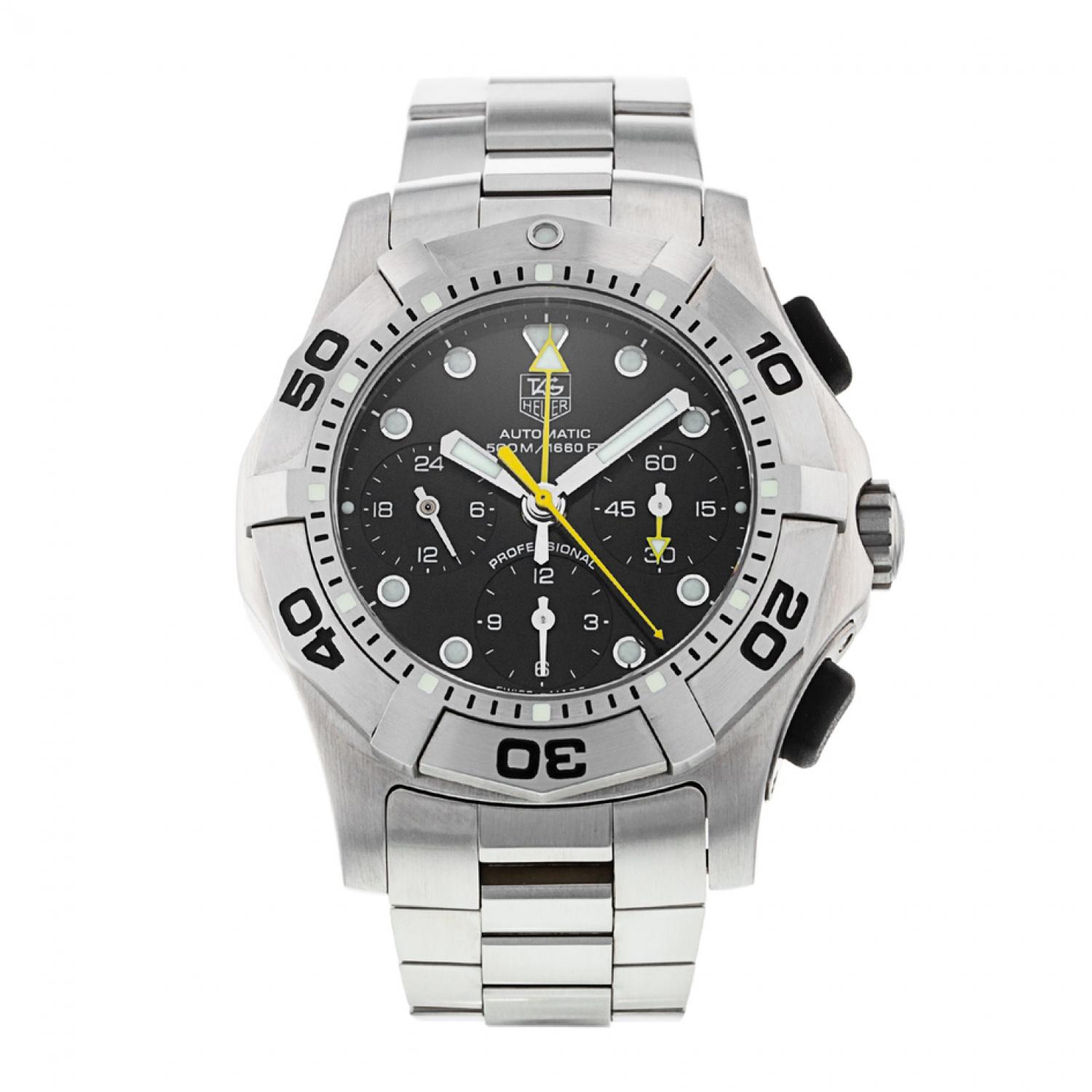 The Aquagraph is a superb diving watch made for practical use—it just so happens to look great as an added bonus. It is remarkable for being the first watch ever made with a chronograph function that you can use underwater. Most chronos let water in when their buttons are operated, but the Aquagraph was built with special rubber pushers that remain sealed at all times—to our knowledge, this makes it the only mechanical watch that can do this. You still can't unscrew the crown to set the time while below the waves, but there is a little coloured gasket that becomes visible if you attempt to do so, warning you that water resistance has been compromised. The caseback is engraved with an illustration of an old-fashioned diver's helmet.