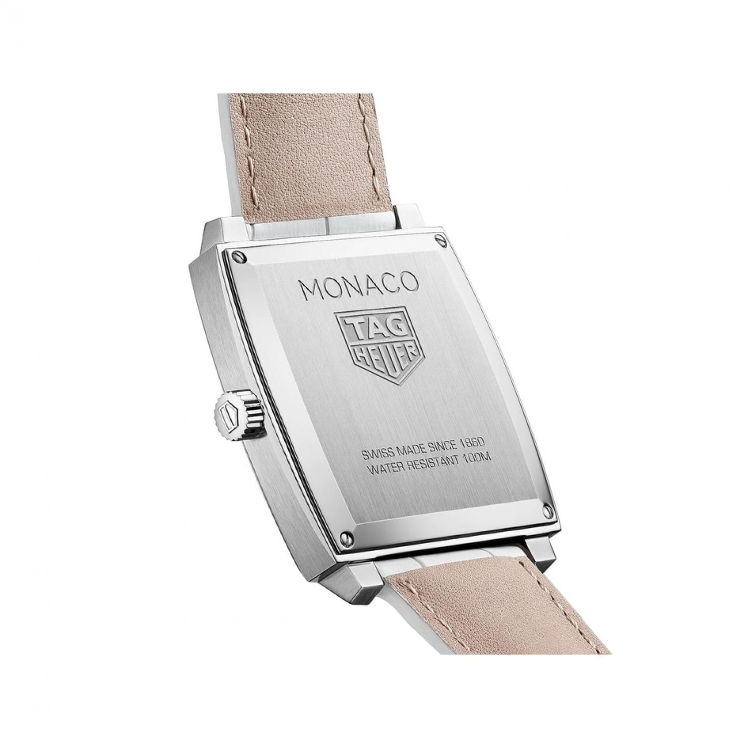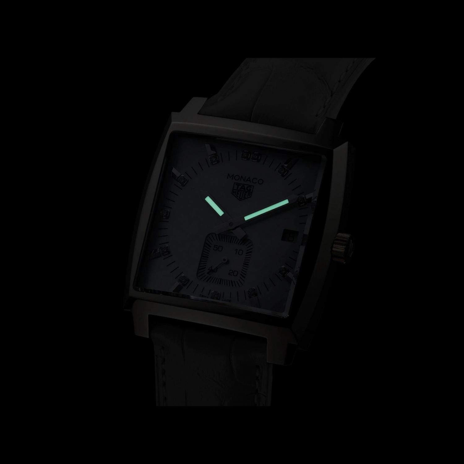 A serious piece of head-turning eye candy: 12 white diamonds on a white mother-of-pearl dial and an on-trend, very feminine strap in white alligator. The distinctive 37mm square-shaped case is in polished steel, as is the crown at 3 o'clock. The most glamorous Monaco yet.