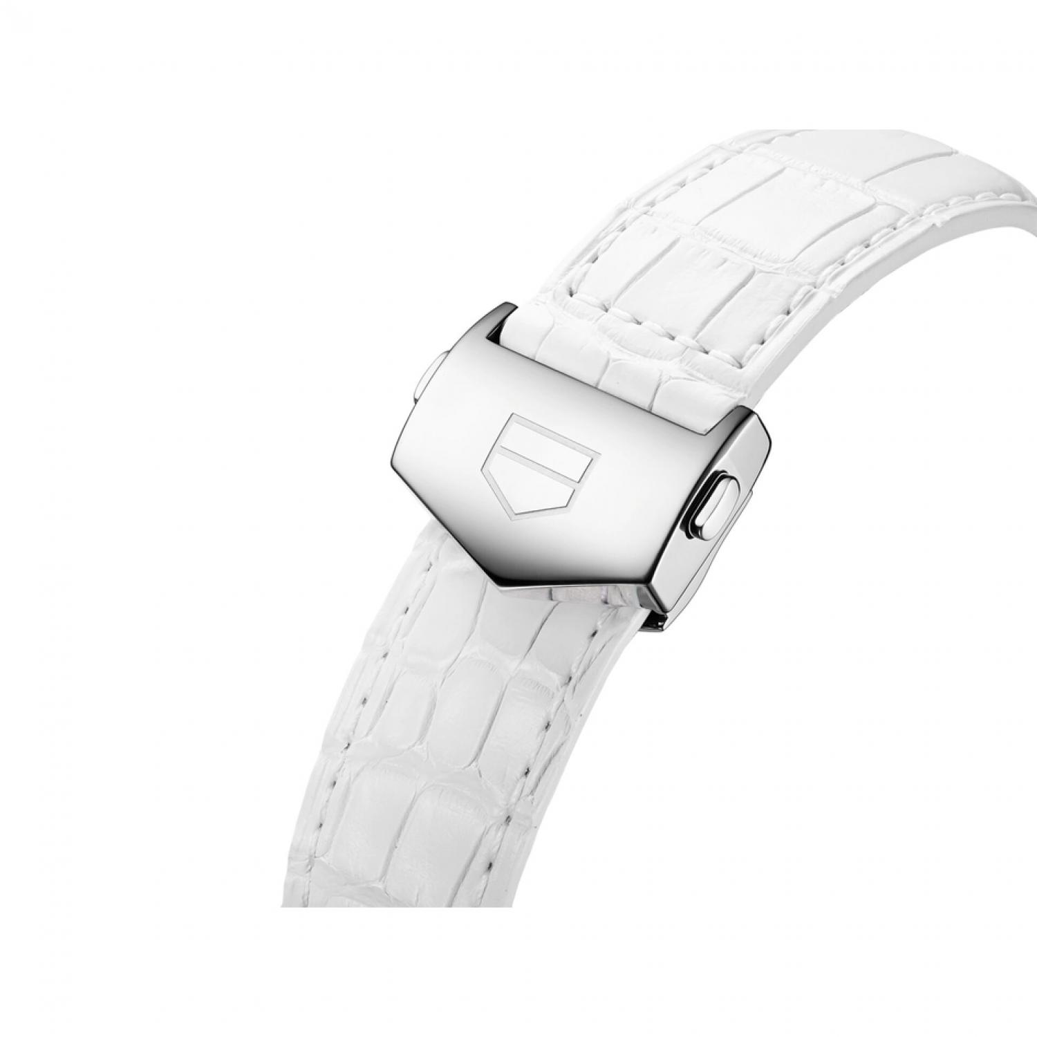A black TAG HEUER logo contrasts smartly with the white mother-of-pearl dial. Rhodium-plated Super-LumiNova® applied indexes and hands add to the alluring sheen. As does the white mother-of-pearl permanent second counter at 6 o’clock, which is graced with a fire-red hand.