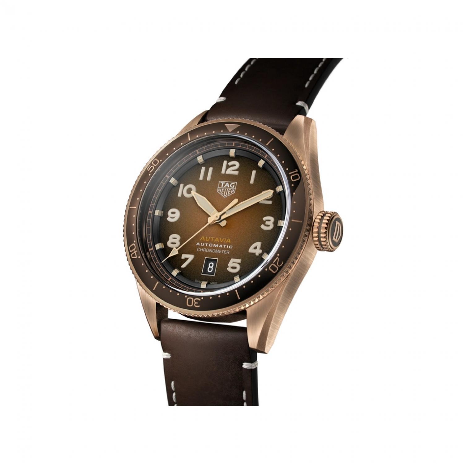 A sober men’s automatic watch inspired by vintage pilot’s watches, with bronze case and chocolate brown smoked dial. The vintage design is reinforced by advanced materials, including titanium for the case back and brown ceramic for the bidirectional turning bezel.