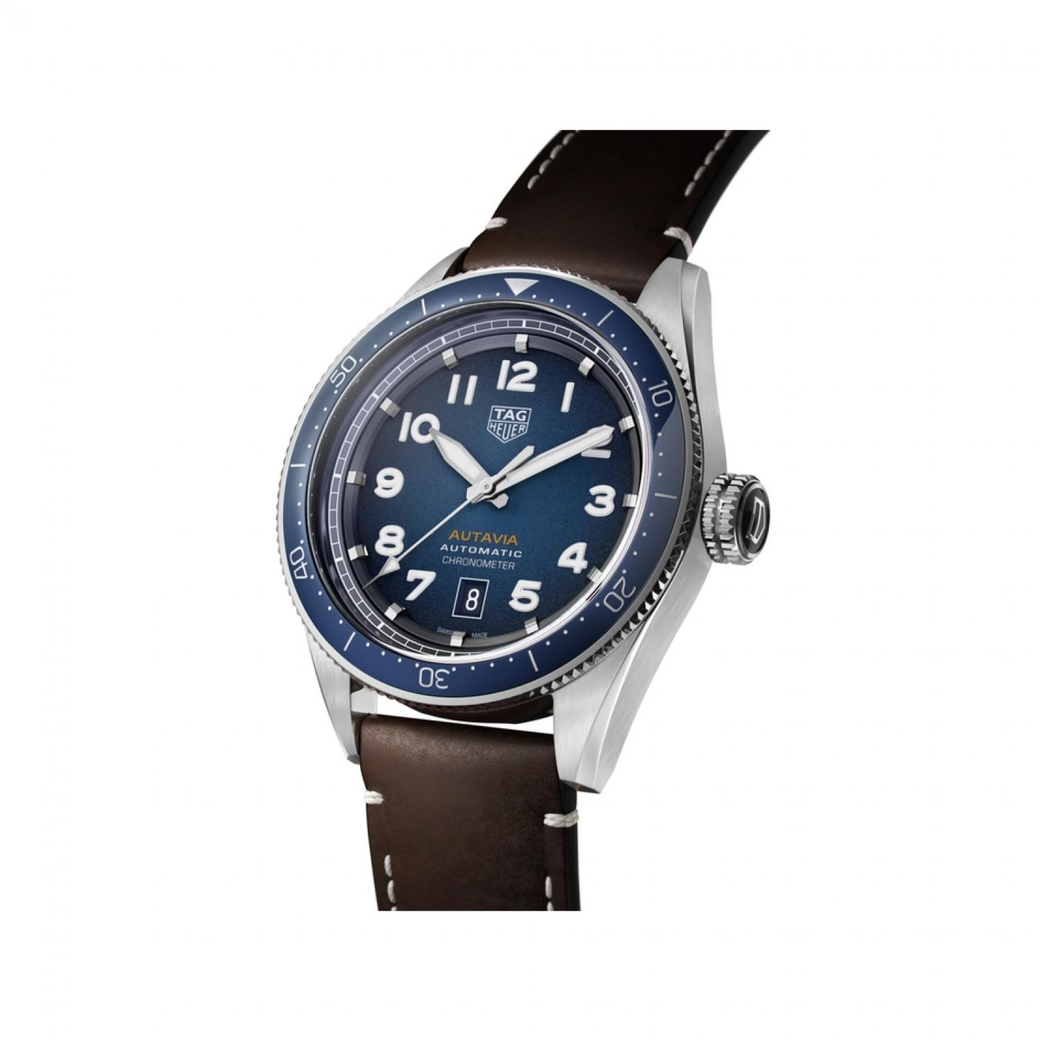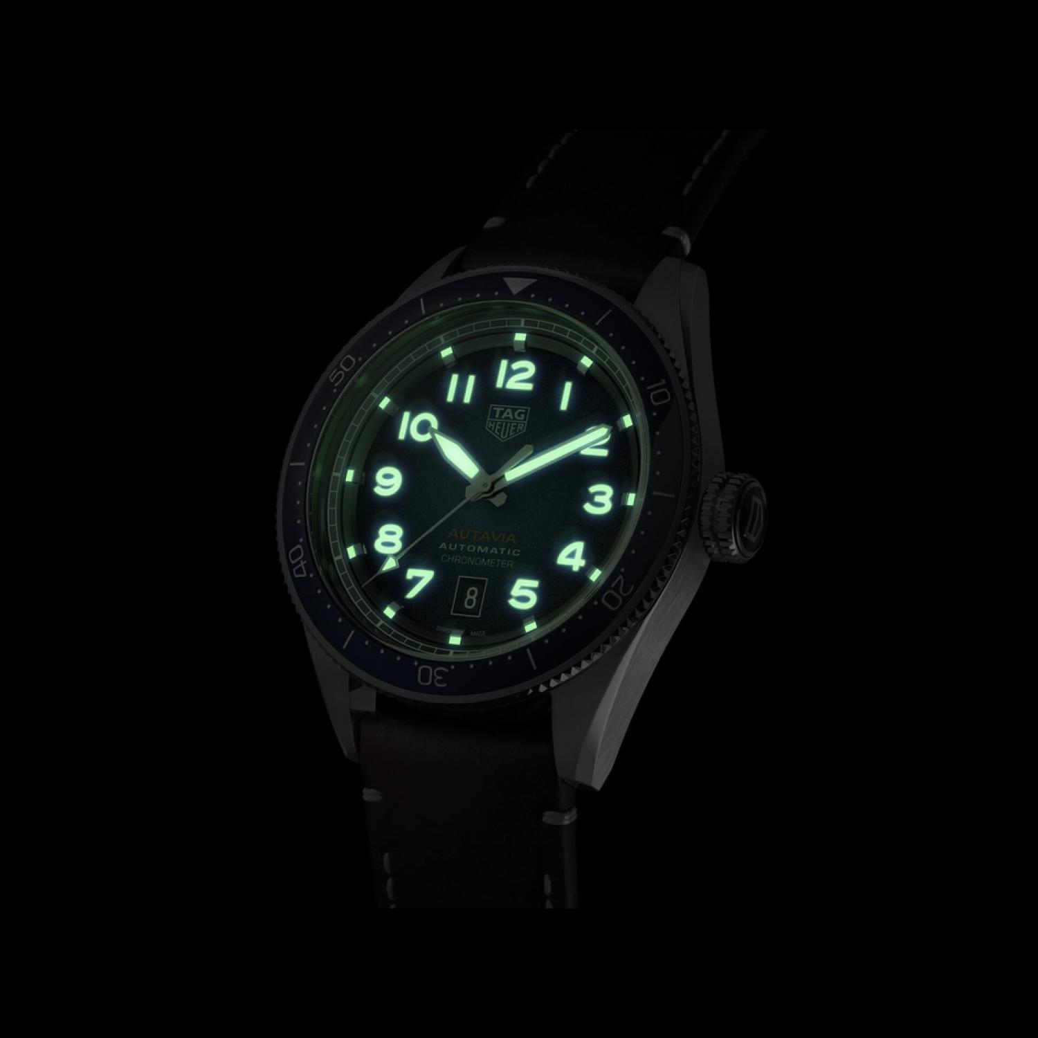 The dial’s “orange peel” gives alluring depth and grace to the design. The silver-toned numerals and hands are Super-LumiNova® treated for extra punch. On the back, an iconic engraving of airplane propeller inside a steering wheel evokes the Autavia’s aviation and automobile roots.