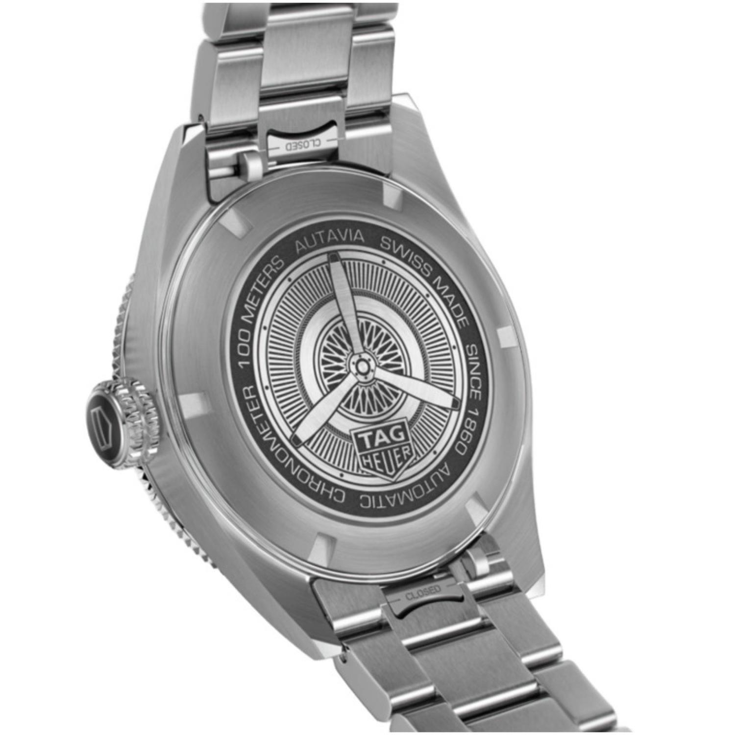 A curved double anti-reflective sapphire crystal further emphasize the Autavia’s at-a-glance readability. Vintage-inspired white Super-LumiNova® lume fills the polished hands and markers.