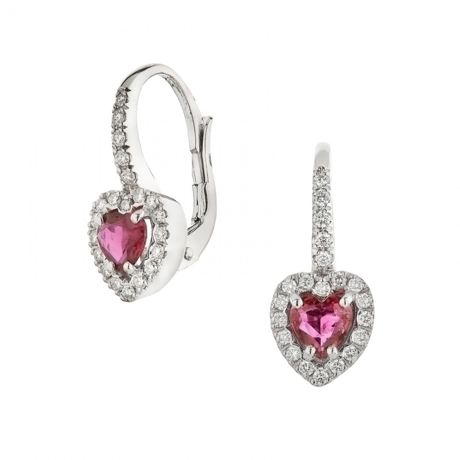 Earrings K18 white gold with heart shape ruby 0,71ct and brilliant cut diamonds total weight 0,23ct
