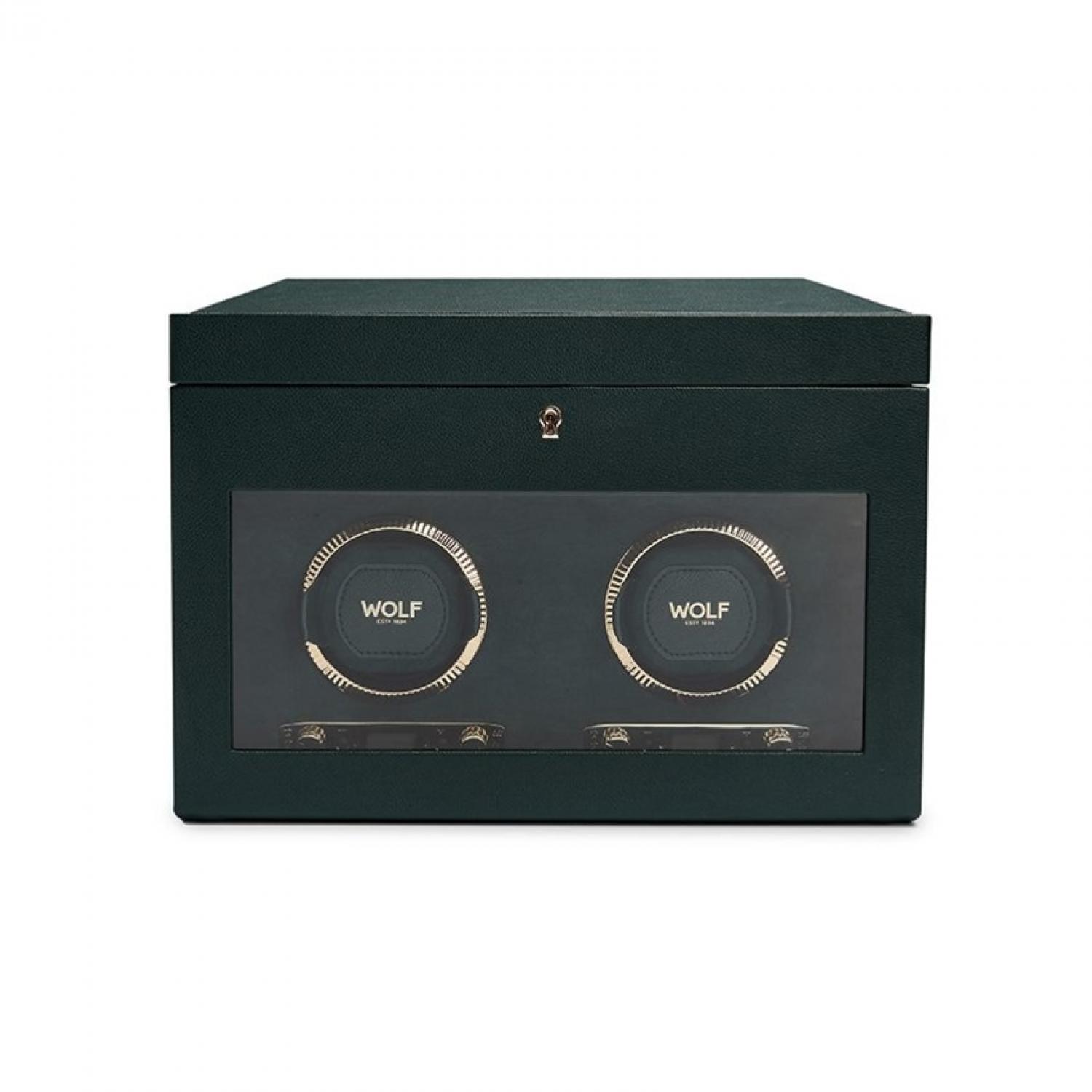 Handmade throughout, British Racing melds the green international motor racing colour of the UK’s cars raced in Ireland in the early 1900’s with a revolutionary quad angled panelled lid. Fine work detailing includes hand-pressed gold foil lines on vegan friendly pebble-grained leather. Gold hardware accents throughout with cushion close hinges and fluted bezel. Another design first from WOLF. Take your watches for a spin in the double watch winder with storage.