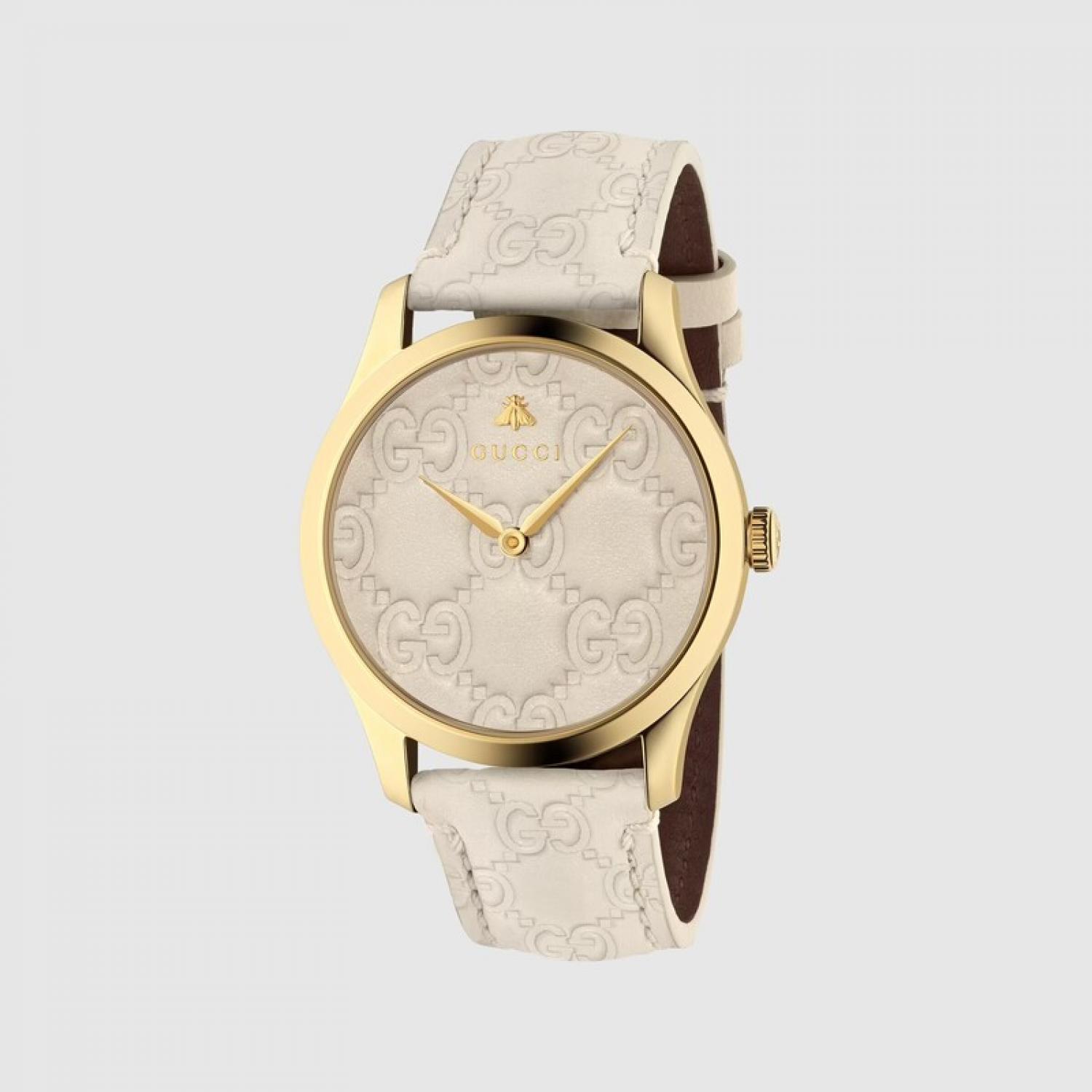 - Yellow gold PVD case, white Gucci Signature leather dial and strap
