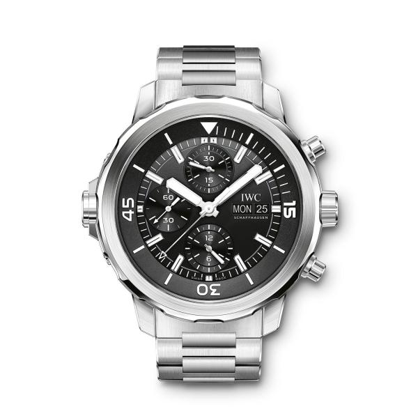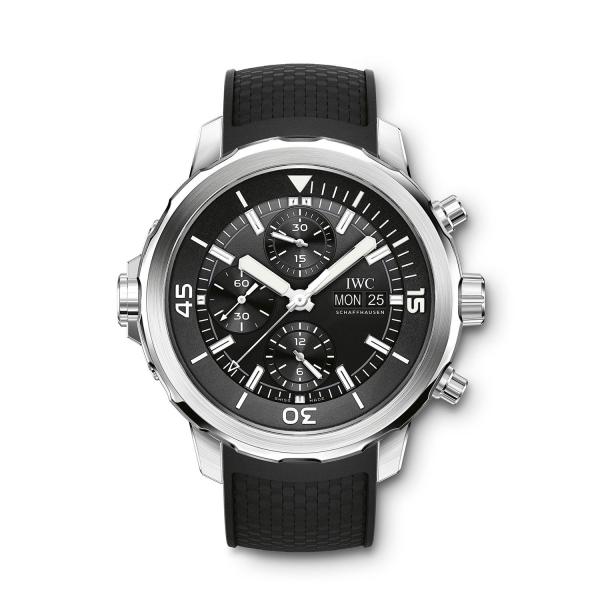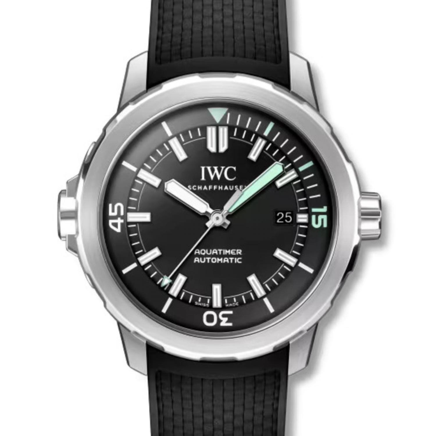 A robust construction, high pressure resistance, easy readability, and innovative technical functionality: these are the key features of the Aquatimer dive watches IWC has been engineering since 1967 and that are used by both professional and recreational scuba divers. The Aquatimer Automatic is a dive watch water-resistant to 30 bar in a 42-millimeter case made of corrosion-resistant stainless steel. The diving-relevant indications on the black dial are coated with green luminous material to ensure optimum legibility under water. At work inside the case is the IWC-manufactured 32111 caliber, which features automatic winding and a power reserve of 120 hours. The innovative external/internal rotating bezel combines ease of use with safety. The rotation of the external bezel is transmitted via a sliding clutch system to the internal bezel. The SafeDive system ensures that the inner ring with the dive time scale always rotates counterclockwise. Therefore, even in the event of an unintentional adjustment, the dive time can never be extended, and the diver's safety is guaranteed at all times. Thanks to the IWC quick-change system, the black rubber strap can be exchanged for another bracelet effortlessly.