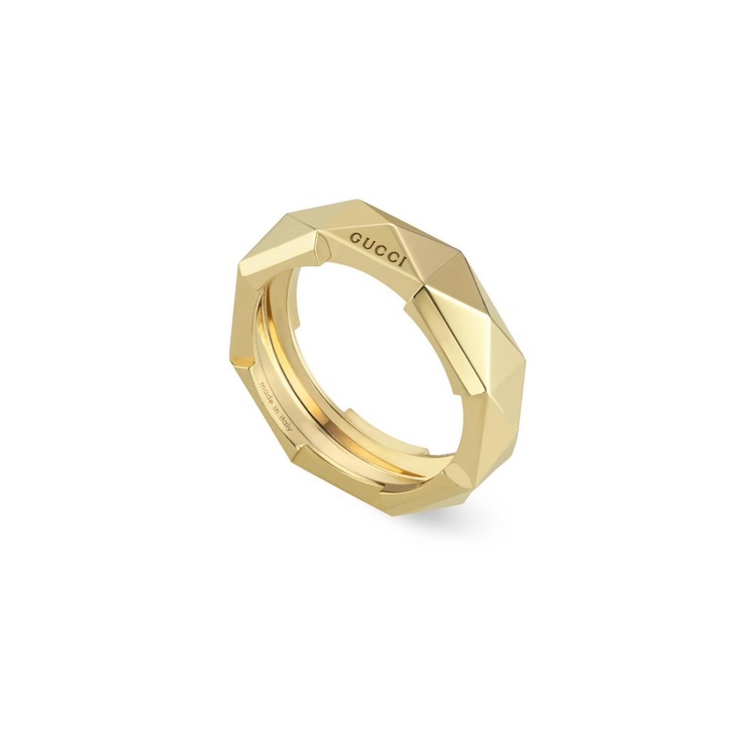 The Gucci Link to Love collection is an exploration of modern romance characterizing new symbols of love. The collection combines different gold tones and a mix of finishings which blend the lines between masculine and feminine. Each piece is meant to inspire individualized ways to wear them with stackable and layered features. This 18k yellow gold studded ring has a stackable mechanism.