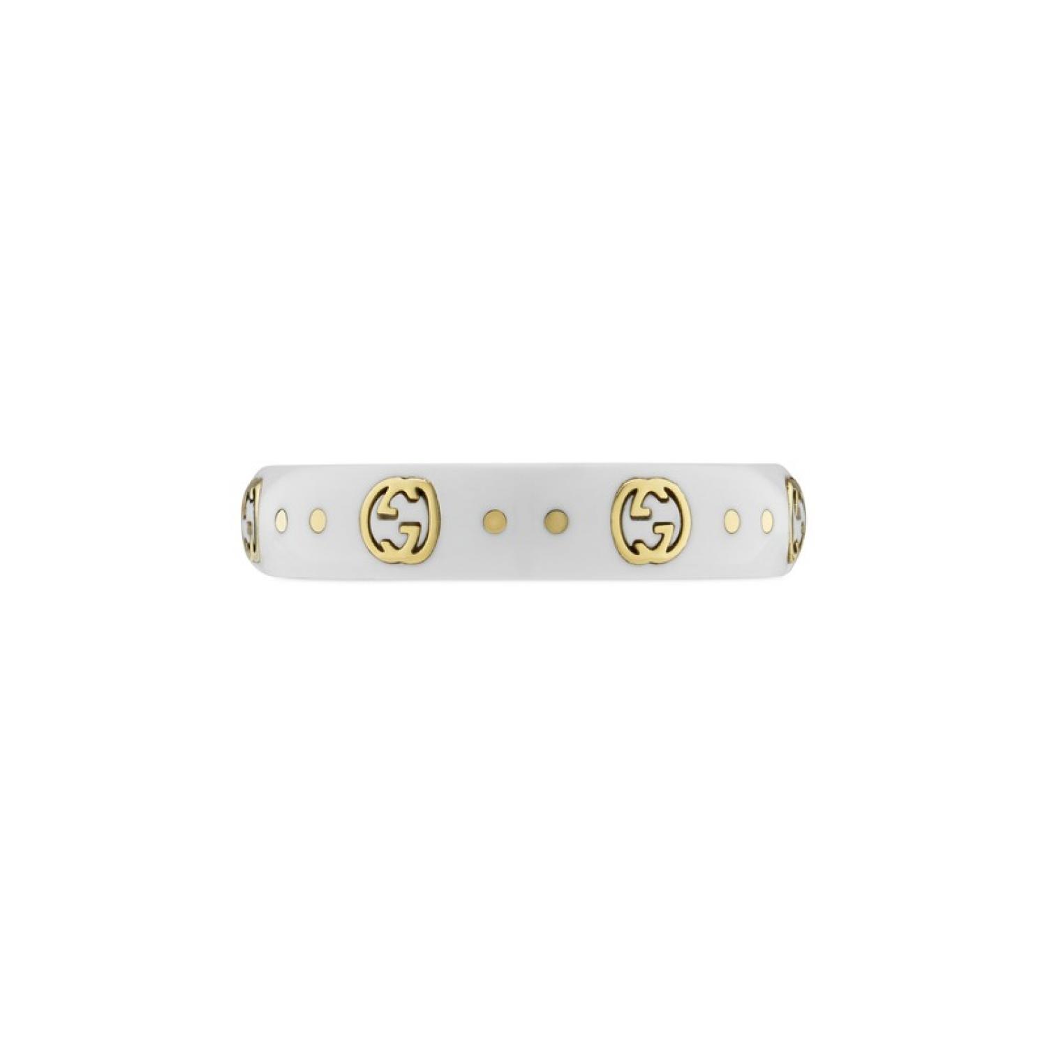 The Icon collection reprises one of the House's most emblematic motifs. The Interlocking G, representative of Founder Guccio Gucci's initials, is presented in yellow gold, contrasting against a white synthetic zirconia band.