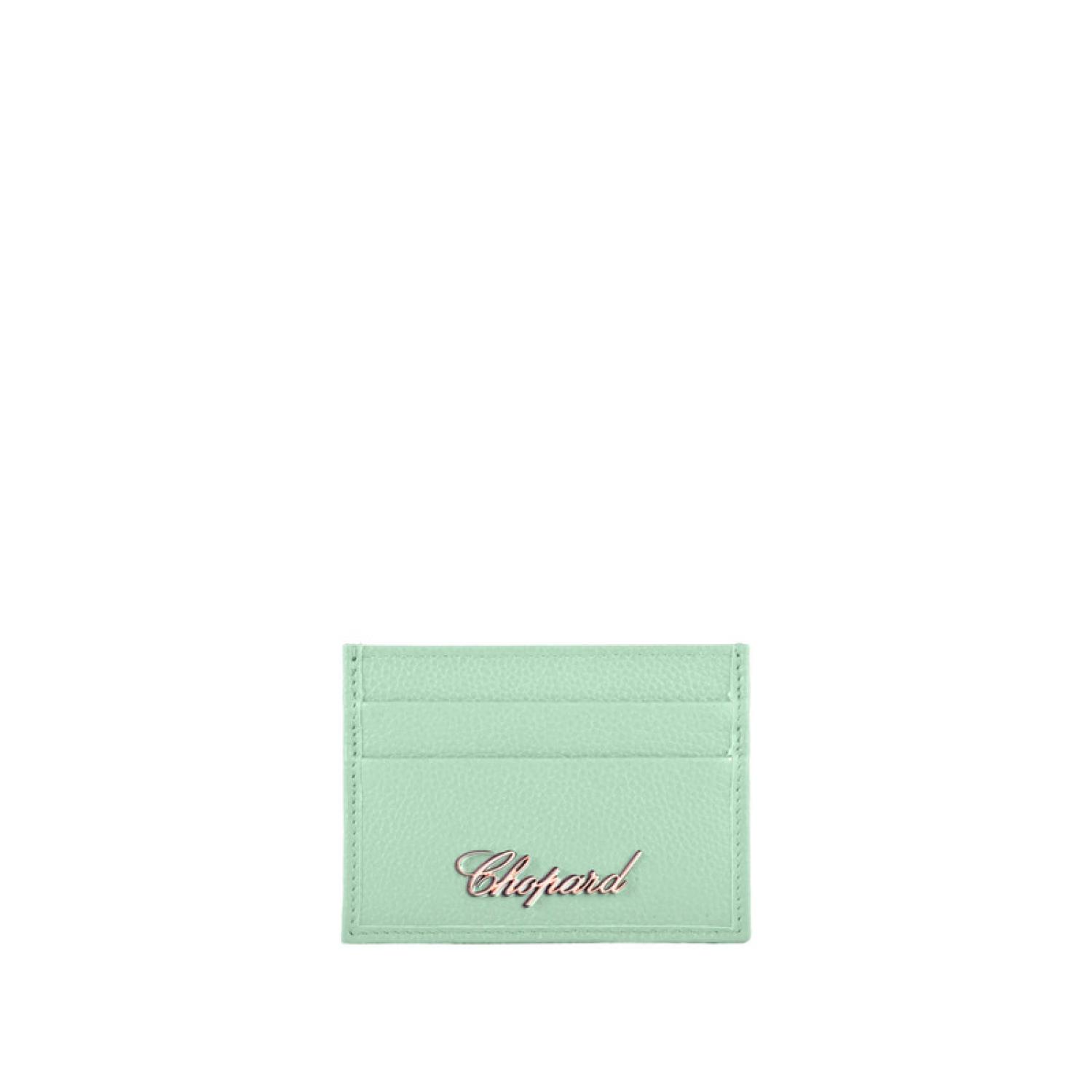 Compact and refined, this card holder slips into your pocket and goes everywhere with you. With its elegant mint green grained calf leather adorned with the Chopard logo in pink gilt letters, it is the quintessence of classic style, as timeless as it is essential.