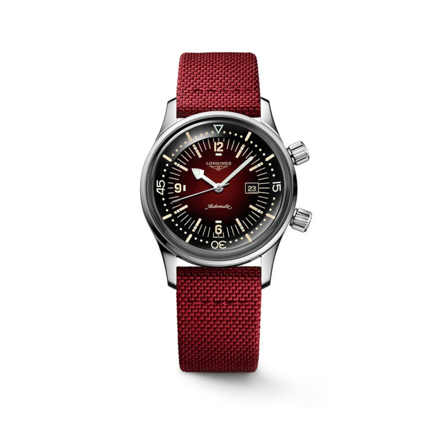 Dial colourBordeauxHour markersPainted Arabic numerals and indexesHandsSilvered polished hands Strap