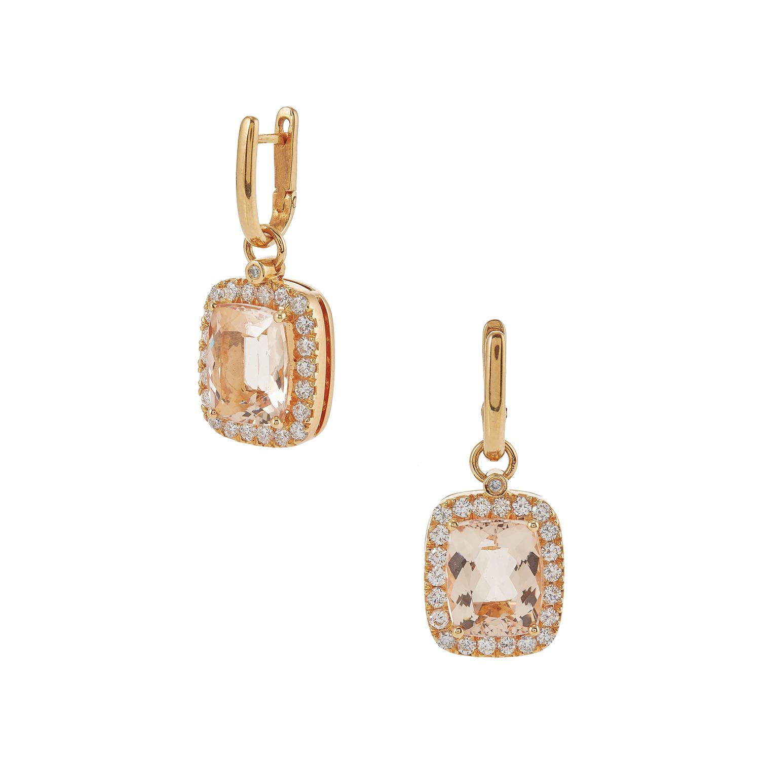 Dangling earrings with pink morganites and diamonds.