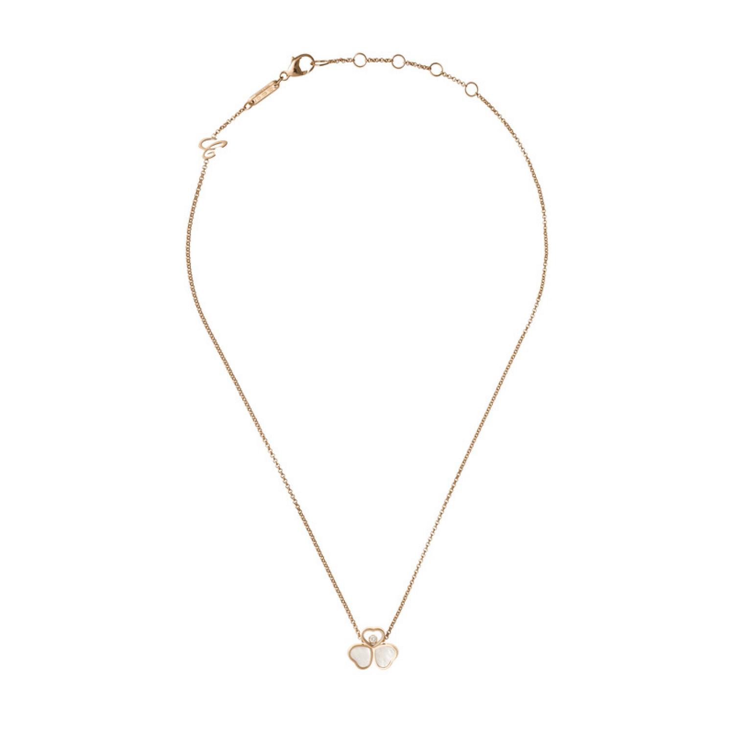 The butterfly, the ultimate emblem of lightness, has infused all its delicacy and symbolic strength into Happy Hearts Wings diamond necklaces. It finds exquisitely refined expression in the design of this luxury jewelry collection, echoing the symbols of the Maison Chopard. Two mother-of-pearl and rose gold hearts, arranged like butterfly wings, are suspended from a heart with a dancing diamond nestling inside. Little Diamonds Do Great Things