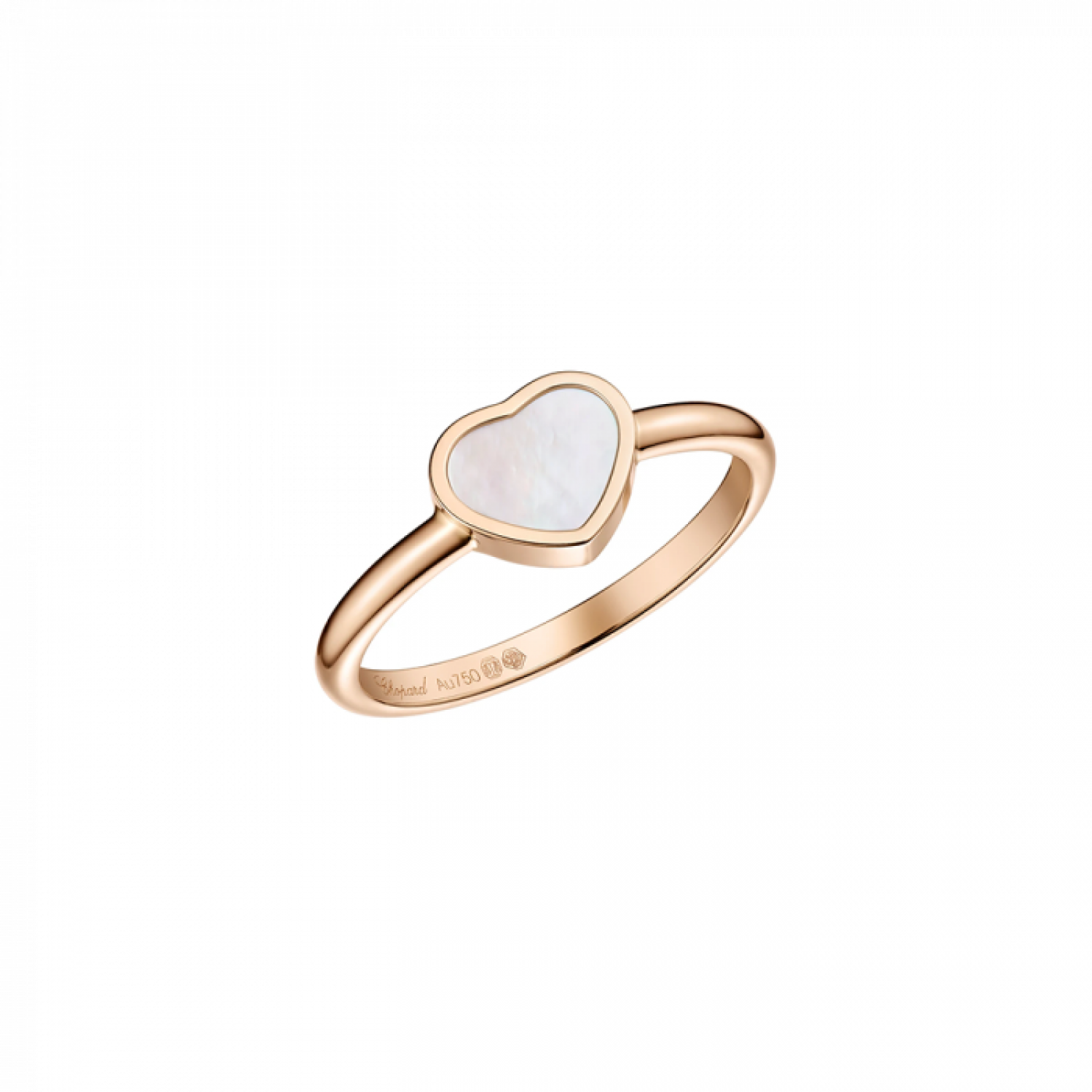 My Happy Hearts jewelry collection borrows its most famous codes, the heart and mobile diamonds, from Chopard's legendary creations. The heart motifs of My Happy Hearts mother-of-pearl rings form a delicate constellation, to be worn alone or stacked as a stylish accessory. Me, Myself and My Happy Hearts.