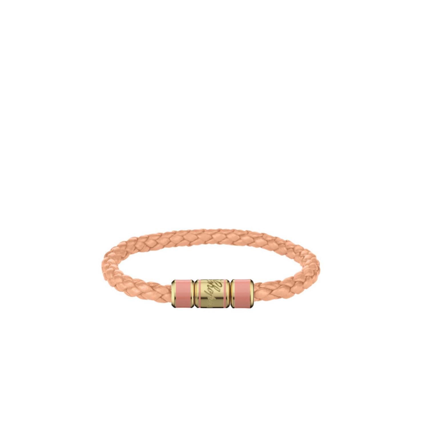 This Signature bracelet in woven peach-coloured lambskin leather oozes seductive charm. Finely engraved with the Chopard logo, the aged gold metal clasp brings a touch of sophistication to this discreet yet distinctive piece of luxury jewellery. A symbol of attachment, friendship or love, it sets the perfect finishing touch to a chic yet casual look.