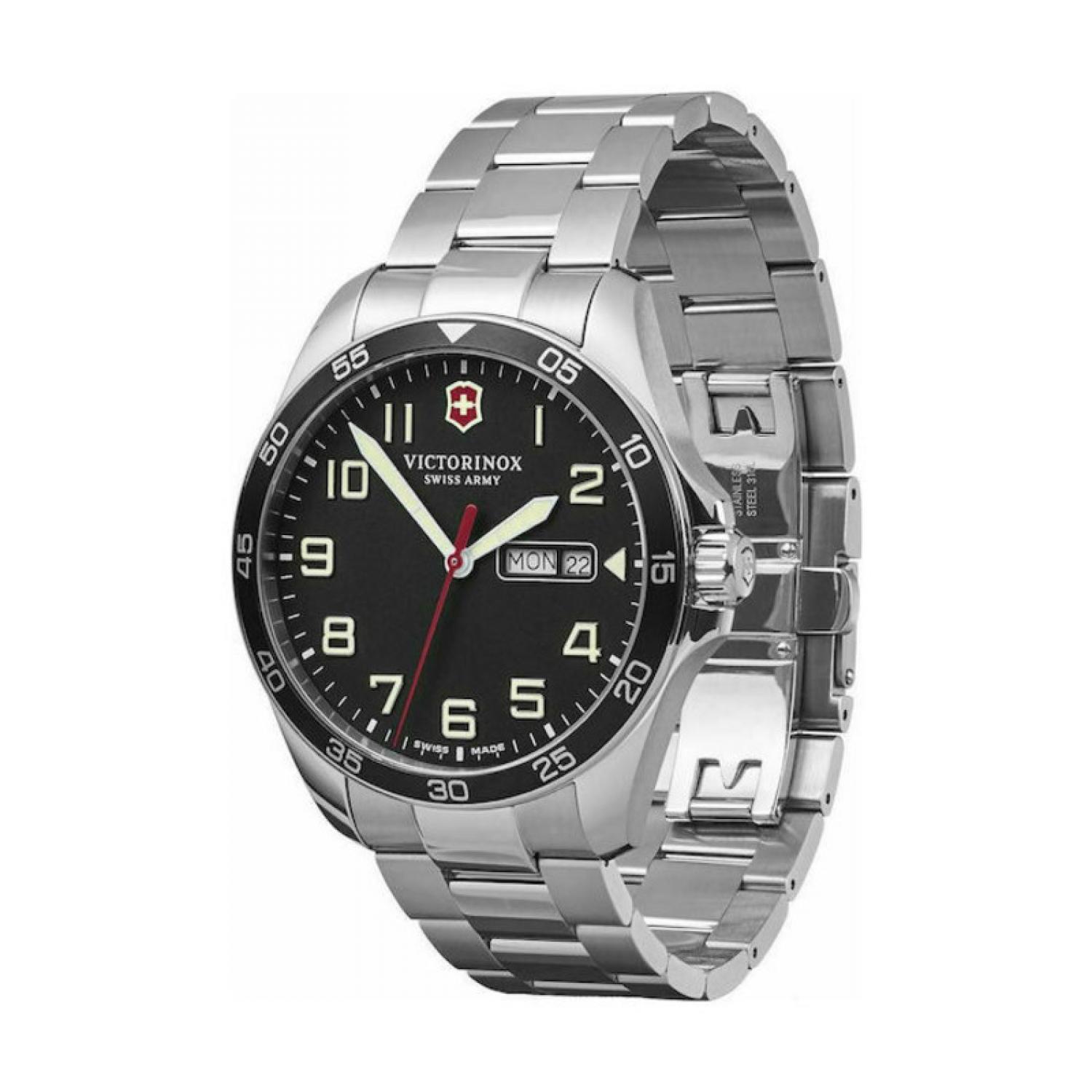 Men's analog watch by Victorinox, medium size with metal bracelet in silver color. It features a battery mechanism, which is based on the electrical energy provided by the battery, resulting in accuracy and durability.