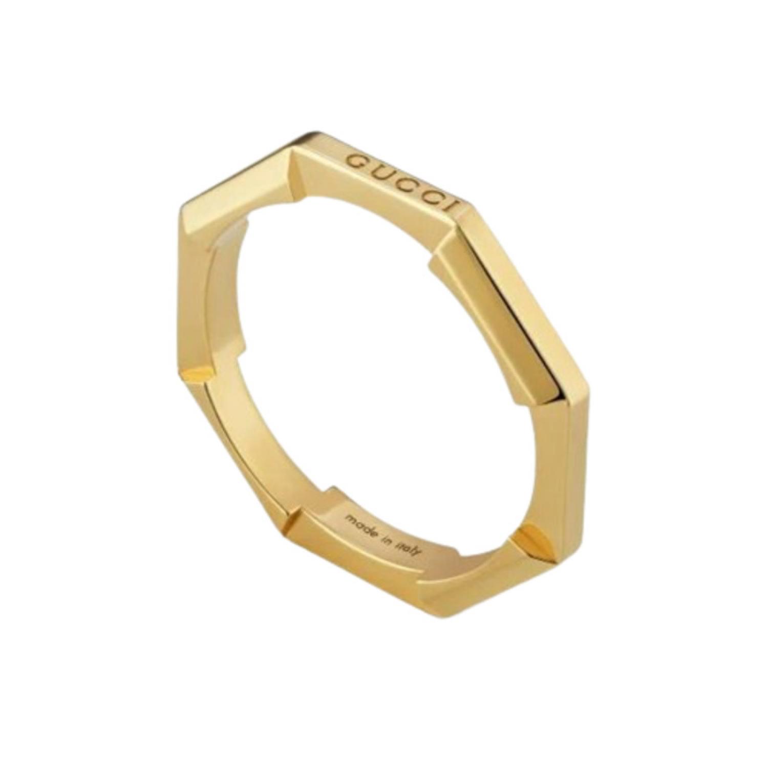 The Gucci Link to Love collection is an exploration of modern romance characterizing new symbols of love. The collection combines different gold tones and a mix of finishings which blend the lines between masculine and feminine. Each piece is meant to inspire individualized ways to wear them with stackable and layered features. This 18k yellow gold studded ring has a stackable mechanism.