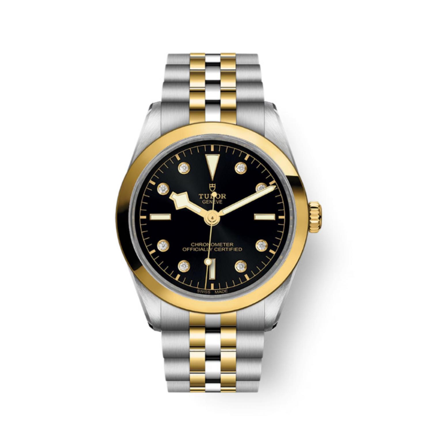 Screw-down winding crown with the TUDOR rose in relief. Steel covered by a 0.1mm yellow gold cap
