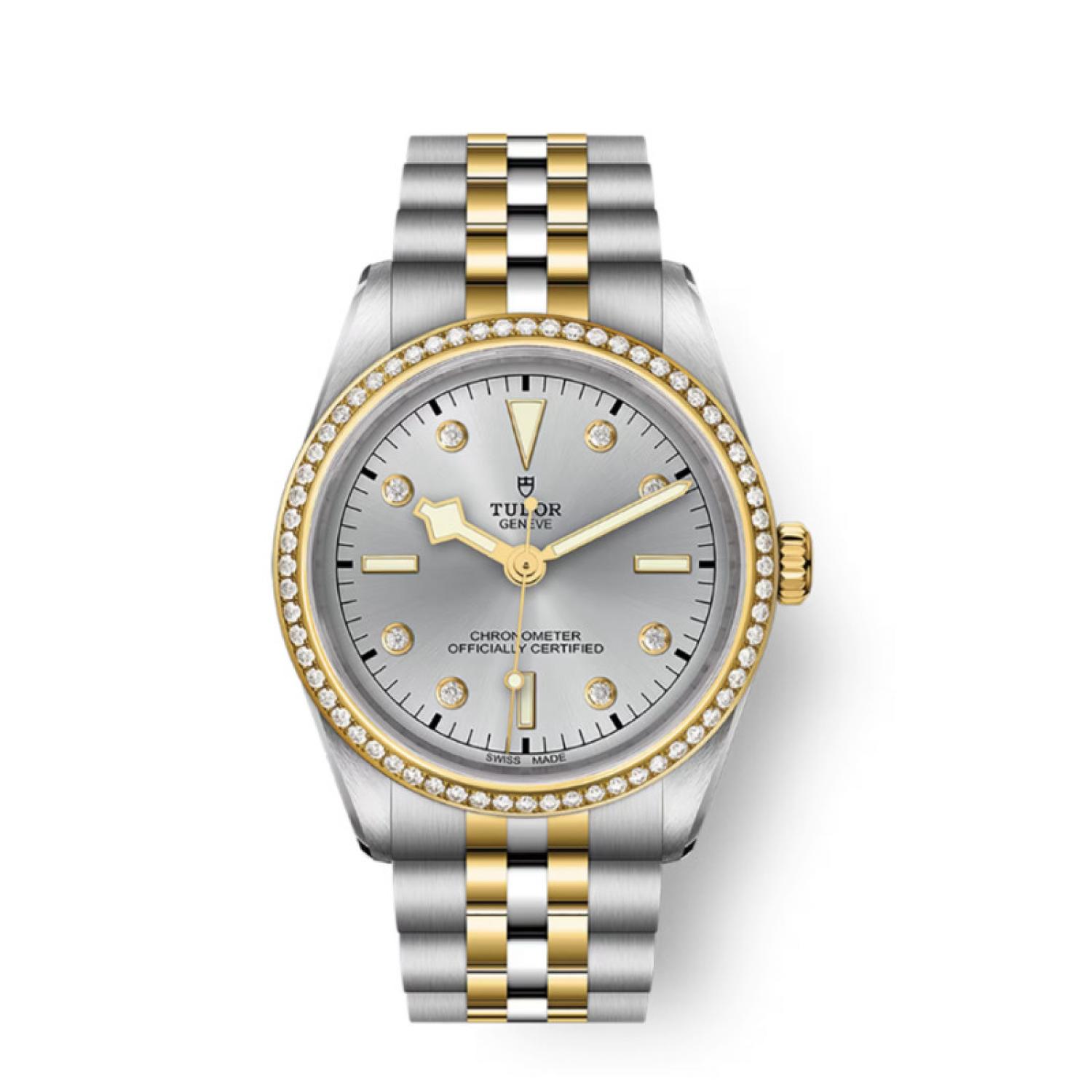 Screw-down winding crown with the TUDOR rose in relief. Steel covered by a 0.1mm yellow gold cap