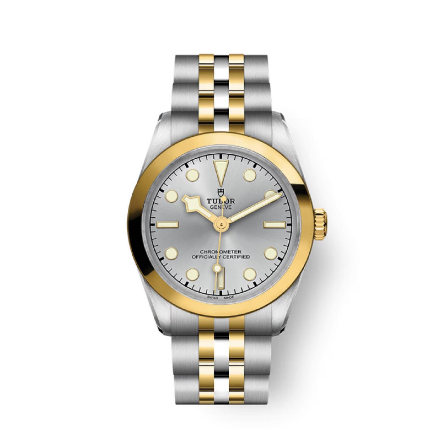 Screw-down winding crown with the TUDOR rose in relief. Steel covered by a 0.1mm yellow gold cap