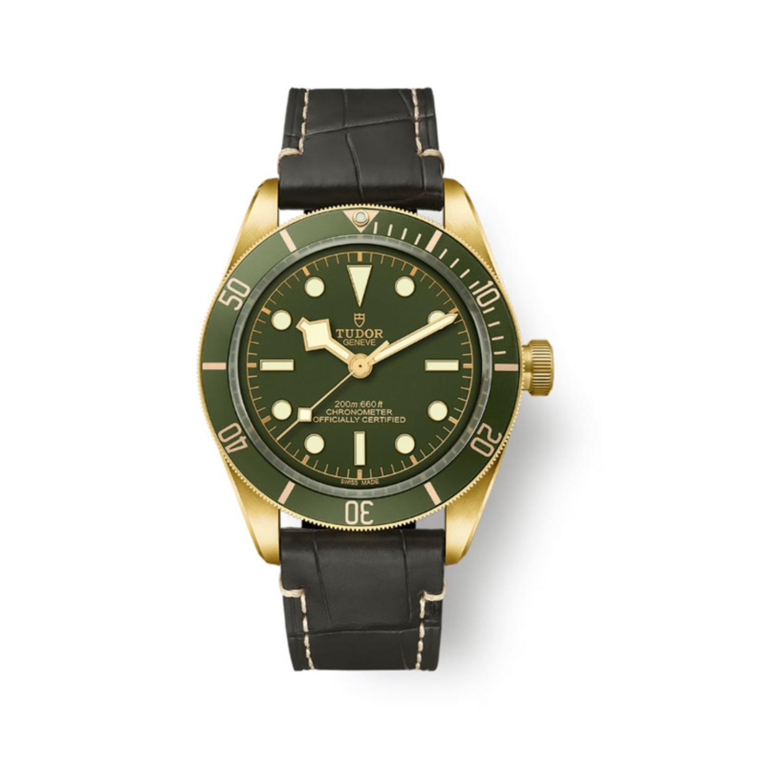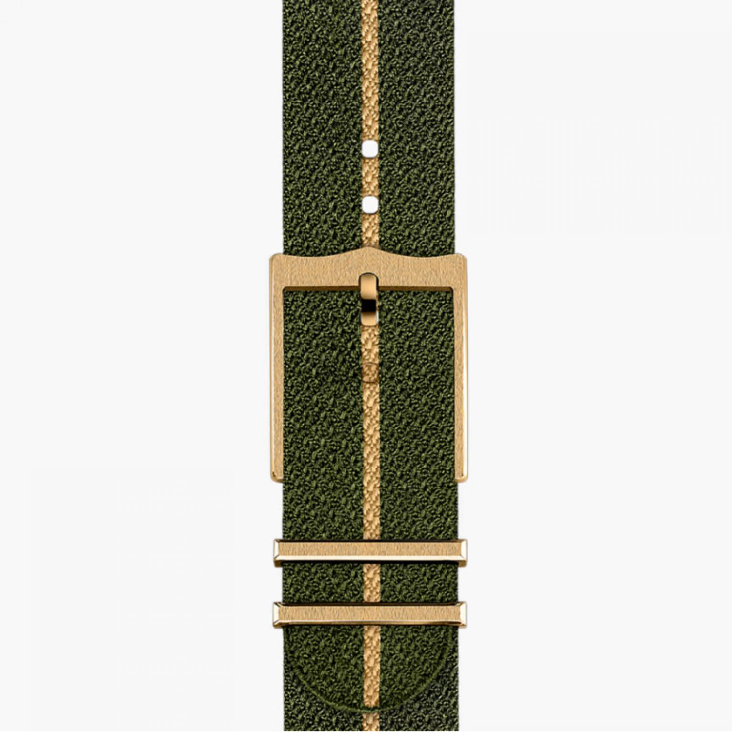 Complimentary green fabric strap with gold-coloured band and 18 ct yellow gold buckle, included in the box