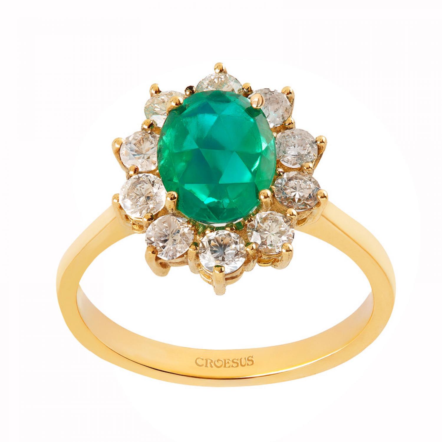 Emerald Rosetta ring with eleven 0.88ct brilliant cut diamonds and a 1.71ct emerald in 4.75gr 18k yellow gold.