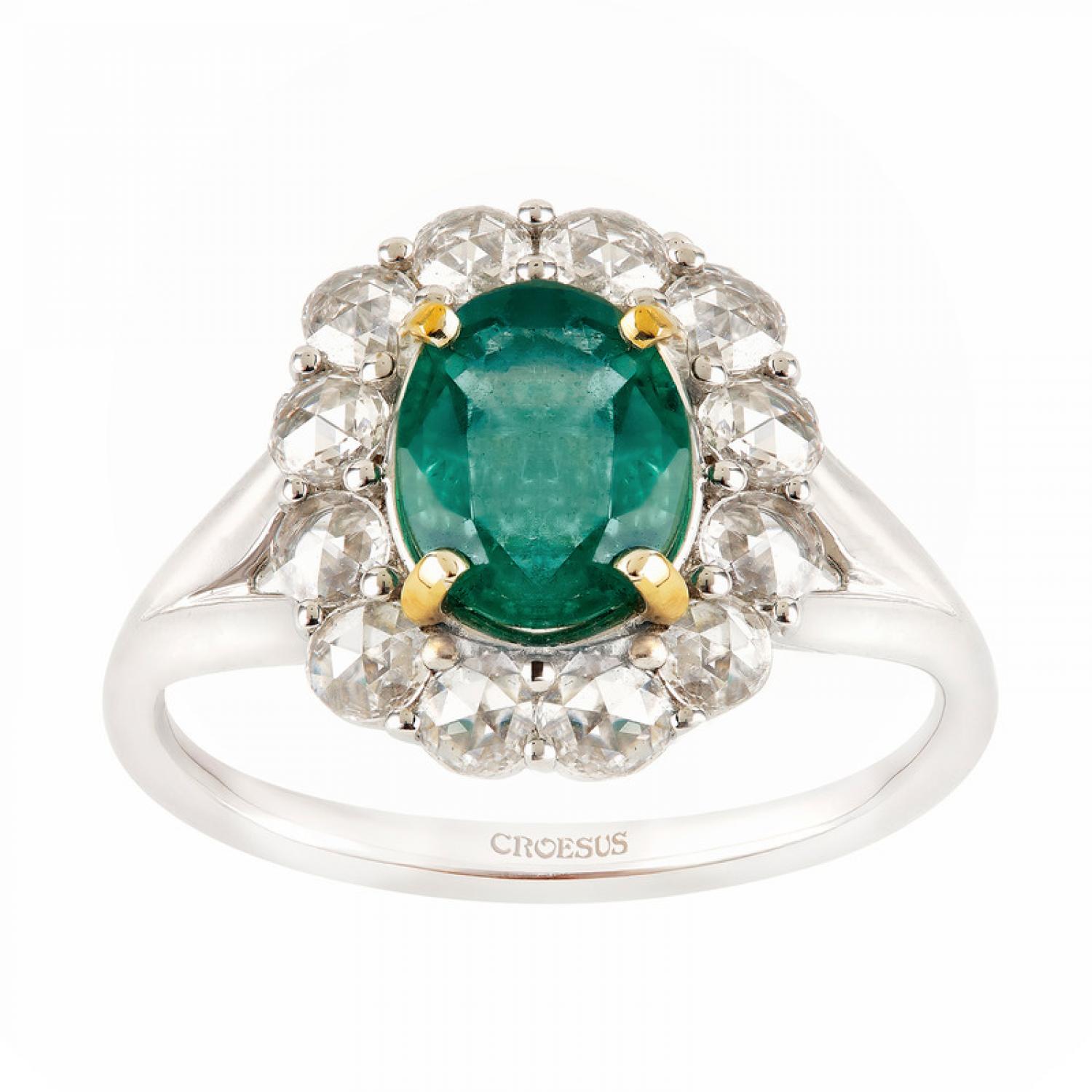 Centerpiece ring with thirteen 0.53ct rose cut diamonds and a 1.04ct emerald in 6gr 18k white gold.