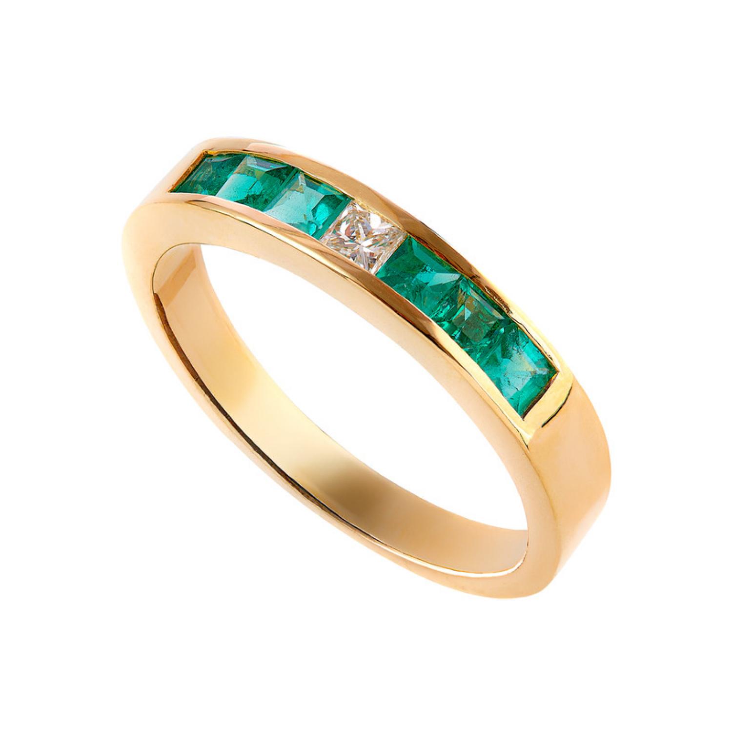 Green Lantern Ring with six 0.41ct princess-cut emeralds and a 0.08ct princess-cut diamond in 3.65gr 18k yellow gold.