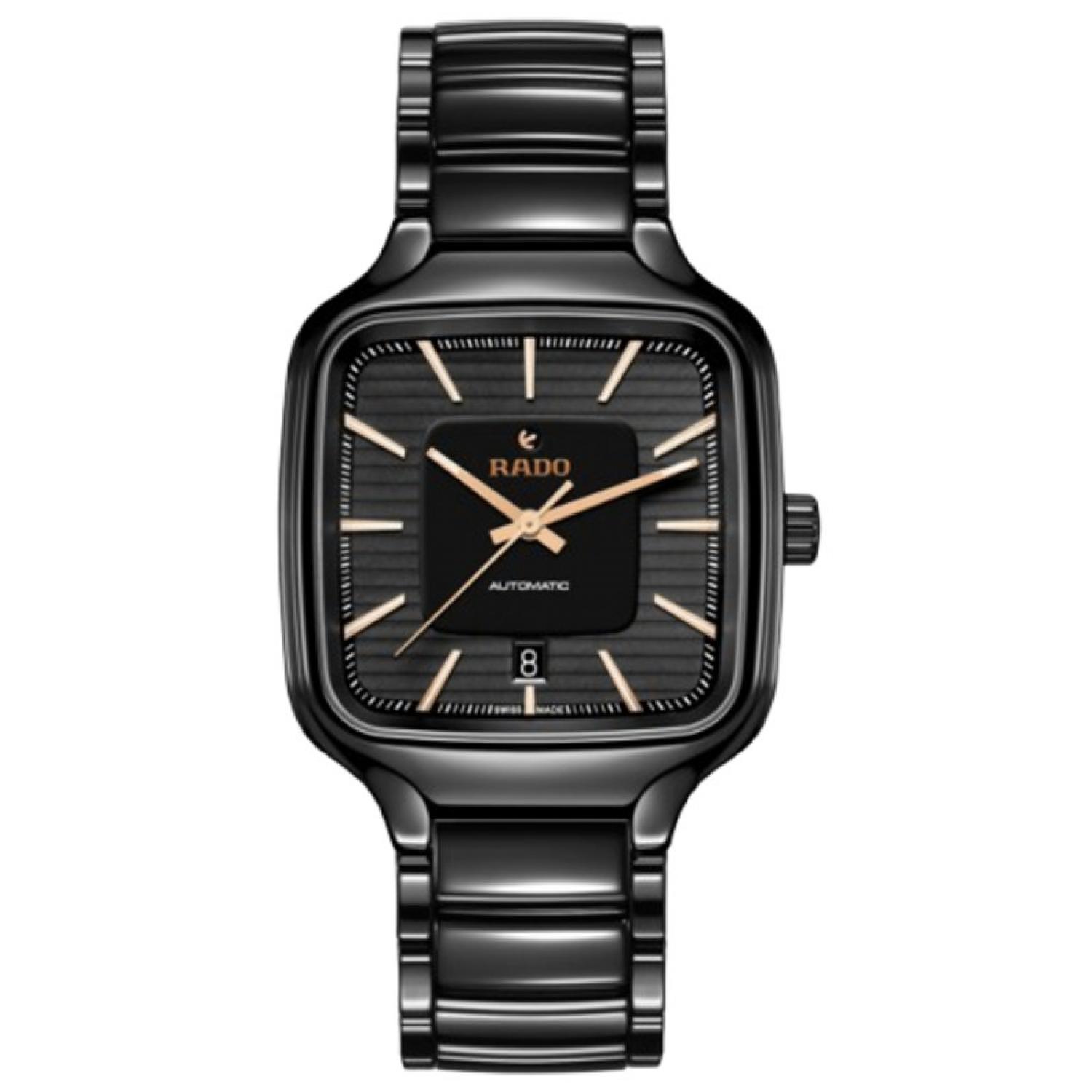 The True Square has a diameter of 38 mm and consists of a polished black high-tech ceramic case and crown and a flat sapphire crystal. Thanks to a Rado R763 automatic movement, the watch keeps precise and reliable time. The rose gold coloured hands and indexes with white Super-LumiNova® match perfectly with the dial that includes a black stamped horizontal structure. The watch is equipped with 80 hours of power reserve and has a water resistance of 5 bar. The pleasant wearing comfort of the True Square is ensured by a black polished high-tech ceramic bracelet with a titanium 3-fold clasp.