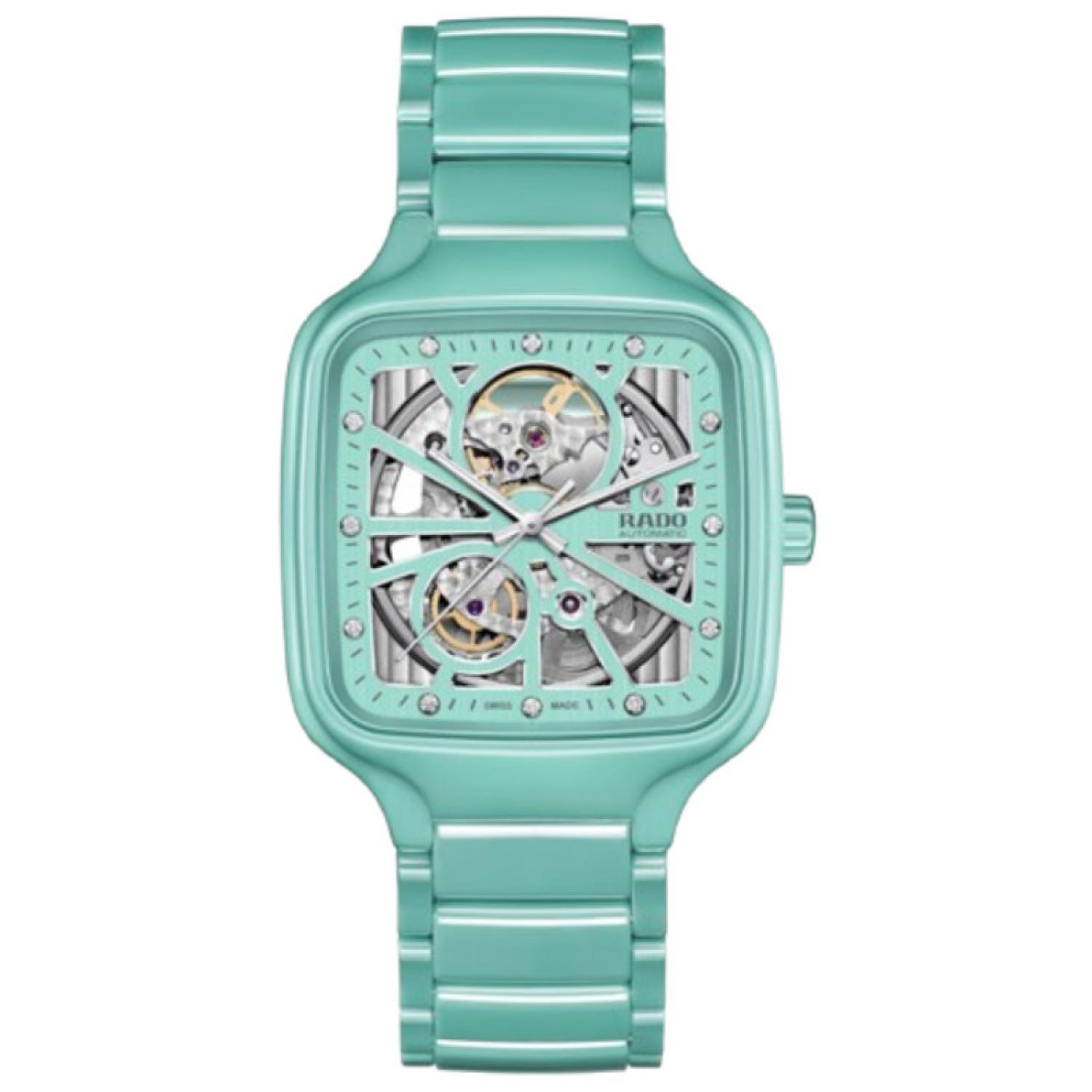 Experience the perfect fusion of artistry and precision with the Rado True Square Automatic Open Heart watch. This remarkable timepiece showcases a captivating open-heart design, allowing you to admire the intricate movements of the automatic Rado calibre R734, with its 80-hour power reserve. With a 38 mm case size, the turquoise high-tech ceramic case and crown exude a sleek and contemporary allure. The flat sapphire crystal, with anti-reflective coating on both sides, offers exceptional clarity. The turquoise dial is accentuated by silver-coloured bevels. Twelve diamonds add a touch of luxury and sophistication. The rhodium-coloured hands, enhanced with white veneer and white Super-LumiNova®, ensure excellent visibility, while adding a subtle touch of elegance. Completing the ensemble is the polished turquoise high-tech ceramic bracelet, offering both comfort and durability.