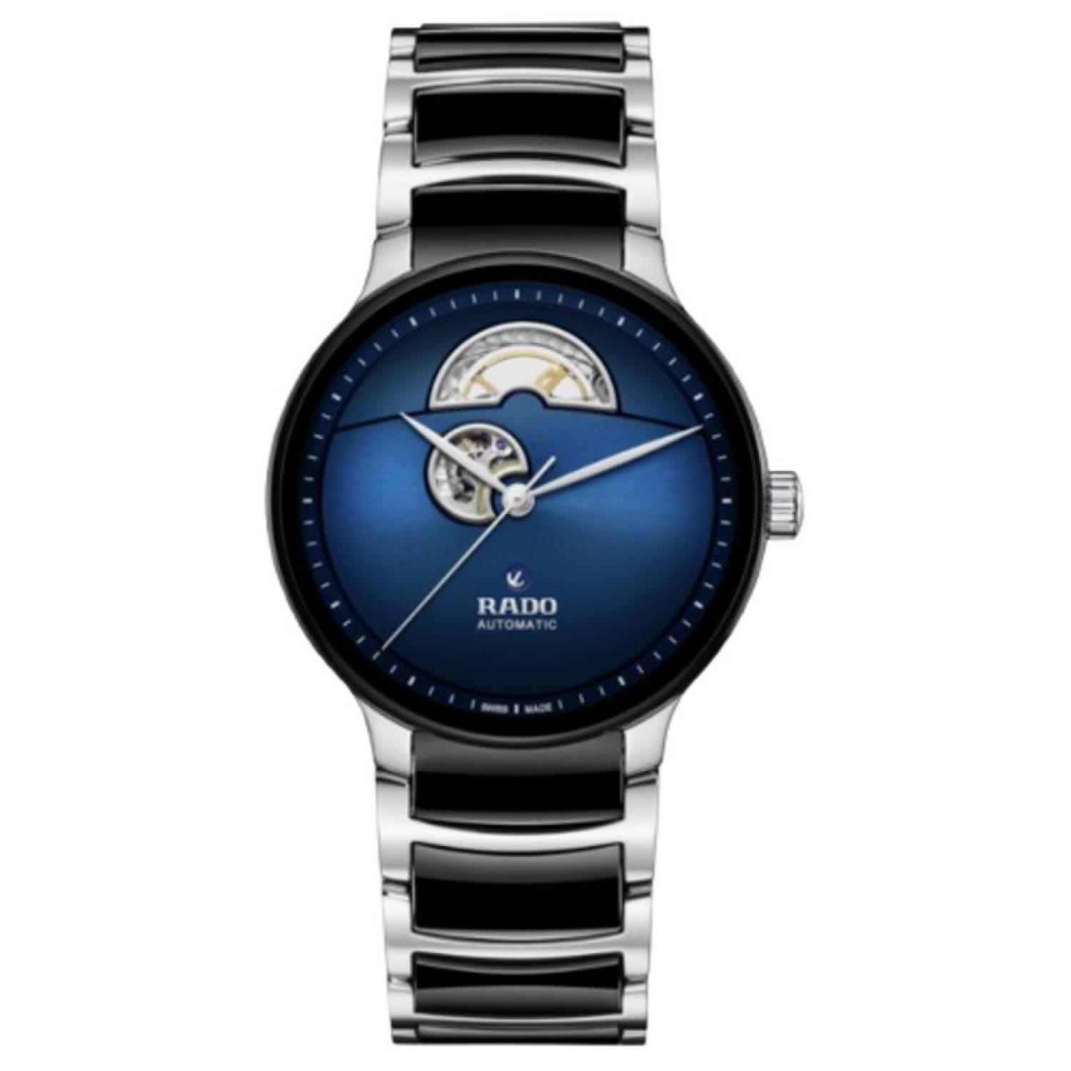 Discover the perfect harmony of innovation and aesthetics with the Rado Centrix Automatic Open Heart. At the heart of this masterpiece beats the Automatic Rado calibre R734 movement, producing impeccable precision and reliability. With an impressive 80-hour power reserve, this watch ensures uninterrupted performance. The antimagnetic Nivachron™ hairspring and adjustment in five positions further enhance its accuracy. Encased in a polished stainless steel case, measuring a refined 39.5 mm, the Centrix Automatic Open Heart showcases meticulous craftsmanship. The polished stainless steel case back, fitted with a sapphire crystal, offers a glimpse into the mesmerizing inner workings of the watch. The dial exhibits a captivating blue to black gradient, adding depth and allure to the watch's design. Complemented by rhodium coloured hands, the dial ensures excellent legibility and a touch of elegance. The bracelet features polished stainless steel and black high-tech ceramic middle links, creating a striking contrast.