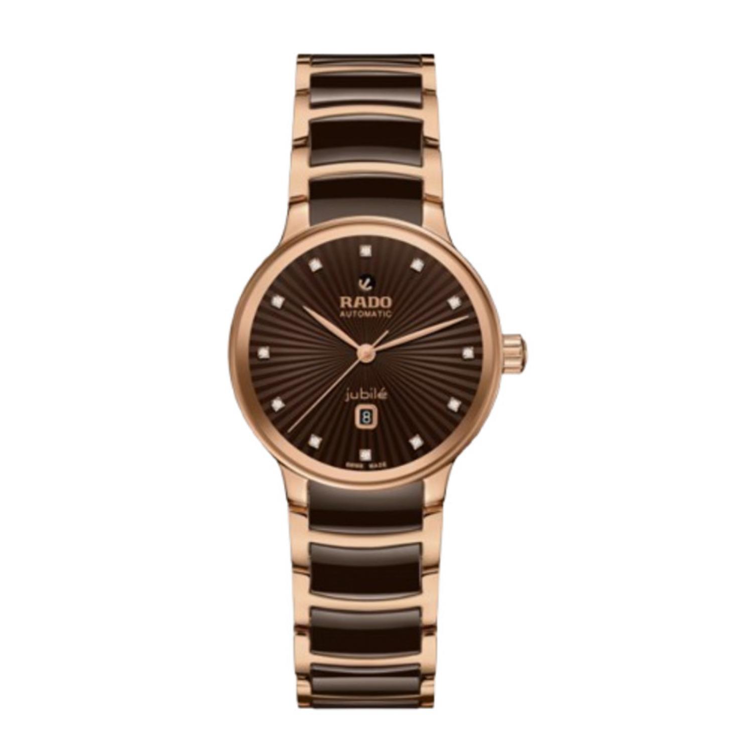 The classic Centrix Automatic Diamonds watch has been reworked not only technically, but also aesthetically. The modified model has a rounded sapphire crystal that extends all the way to the edge and a curved case blending with the curved crystal edge. The overall appearance of this iconic timepiece is completed with adjusted case lugs and a bracelet made of polished rose-gold-coloured PVD-coated stainless steel with brown high-tech ceramic middle links. The brown facetted dial has an opulent 3D effect created by stamping a shaped dial and then filling it with lacquer. Inside, the three-hand calibre R582 movement exceeds standard accuracy test requirements from 3 to 5 positions, thanks to its antimagnetic Nivachron™ hairspring for increased reliability and accuracy. The watch is water resistant down to 50 m and offers 48 hours of power reserve.