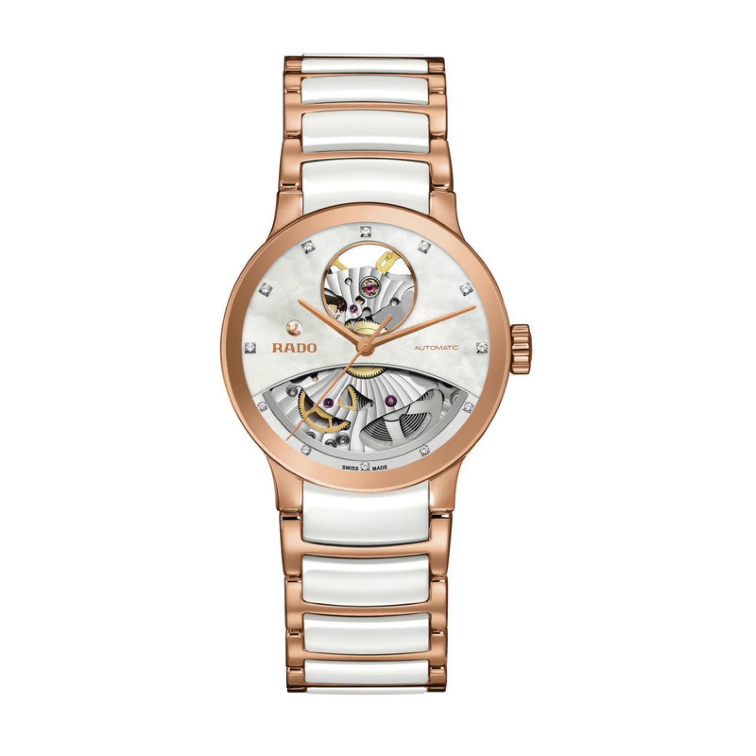 Experience the harmonious blend of artistic expression and design stylings with the Rado Centrix Open Heart watch. As the constellations write their eternal stories above our heads, they build bridges for lovers to meet. A large window, reminiscent at once of dawn and dusk, beautifully frames a state-of-the-art R734 automatic movement with 80 hours of power reserve and an antimagnetic NivachronTM hairspring, as well as a deeply elegant rippled-sunlight "ondulé soleil" motif on chosen component surfaces. The overall appearance of this iconic timepiece is completed with adjusted case lugs and a bracelet made of polished rose-gold-coloured PVD-coated stainless steel with white high-tech ceramic middle links. The white mother-of-pearl dial with 12 diamonds, emphasised with the rose gold coloured printed “jubilé” logo, matches perfectly with the hands. The watch is water resistant down to 50 m.