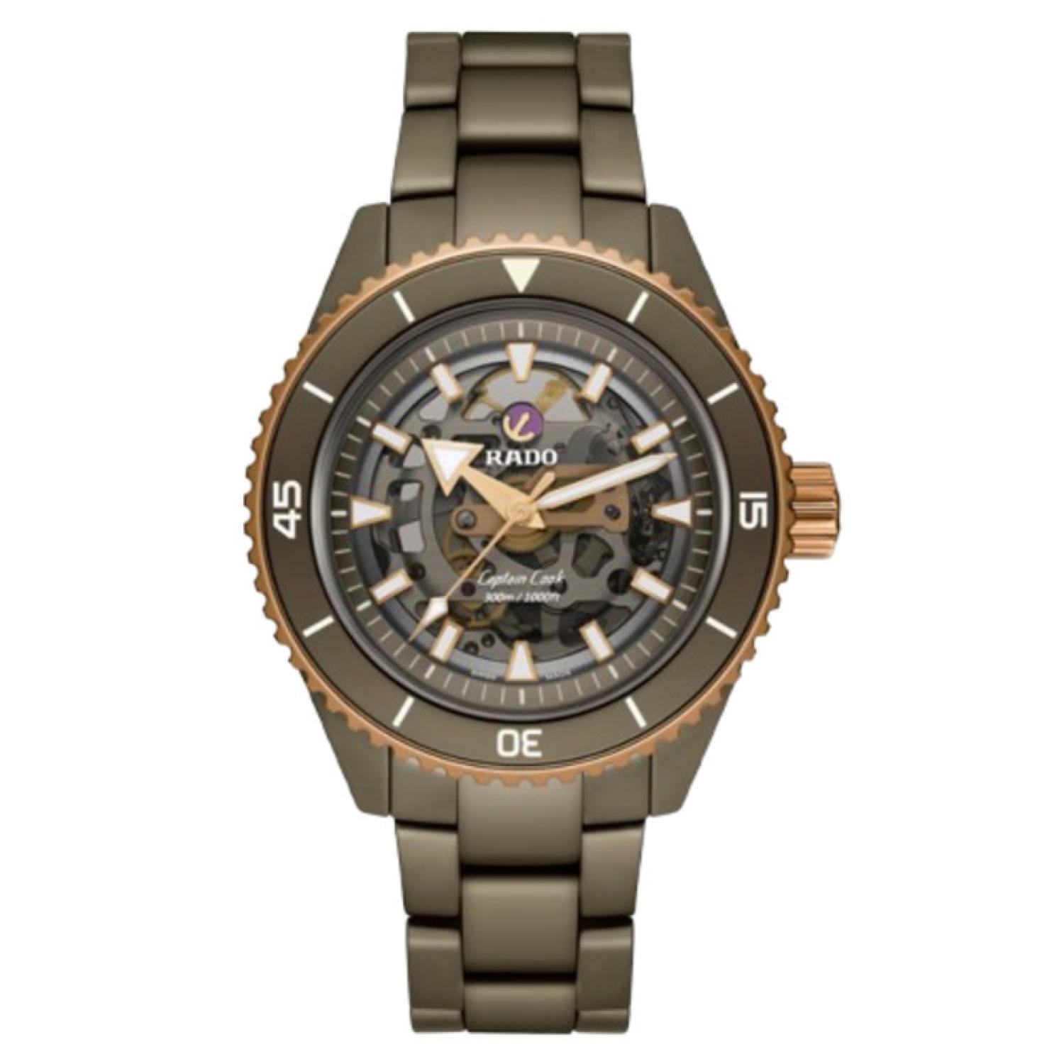 The Captain Cook High-Tech Ceramic Skeleton showcases its innovative R808 movement, a marvel of contrasts, know-how and clever geometry, that allows a distinct view of the various parts. It’s equipped with an anti-magnetic and highly reliable Nivachron™ hairspring that has been fully tested in five positions and provides up to 80 hours of power reserve. The superb matt olive-green high-tech ceramic monobloc case is topped by a rose-gold-colour rotatable bezel with a matt olive-green ceramic insert to match the case and lugs, for visual harmony. The dial is clear and spartan, with generous geometric indices and hour/minute/second hands in rose-gold tones, treated with white Super-LumiNova® for best readability in low-light conditions. Thanks to a matching olive green high-tech ceramic triple-row bracelet with a titanium three-fold clasp, the new Captain Cook remains loyal with you through the most rugged and demanding of your explorations.