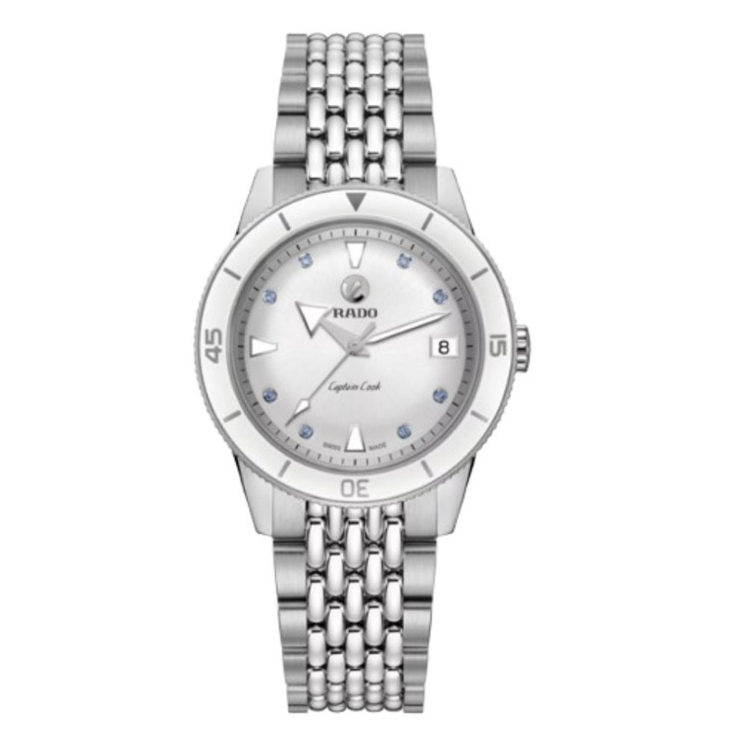 The new Rado Captain Cook Automatic is a contemporary interpretation of the iconic Rado timekeeper. Eight ice-blue sapphires are set as hour markers on a snowy white dial framed by a bezel with a white high-tech ceramic inlay. It comes with three straps – a rice grain stainless steel bracelet, light blue Nato strap, or blue leather strap with blue stitching – which can be easily and quickly exchanged thanks to Rado’s EasyClip system.