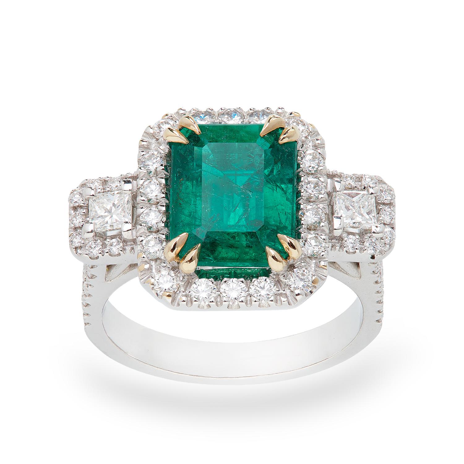 18K White gold ring with 0,52ct brilliant diamonds, 0,24ct princess cut diamonds and a 2,90ct emerald