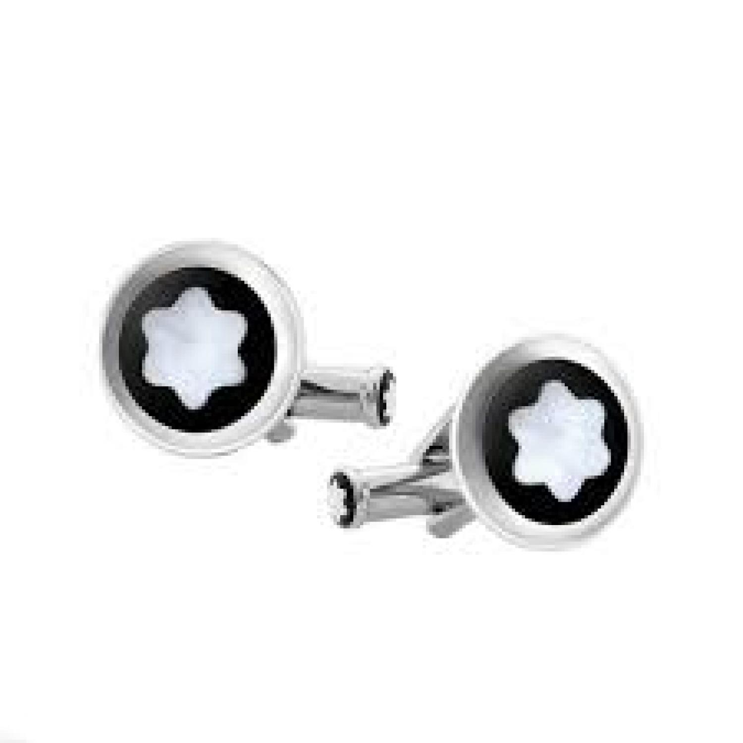 The round Montblanc Star cufflinks in stainless steel with black PVD inlay and mother-of-pearl snowcap emblem are inspired by the codes of the Maison. A collection that features the Montblanc emblem in different interpretations.