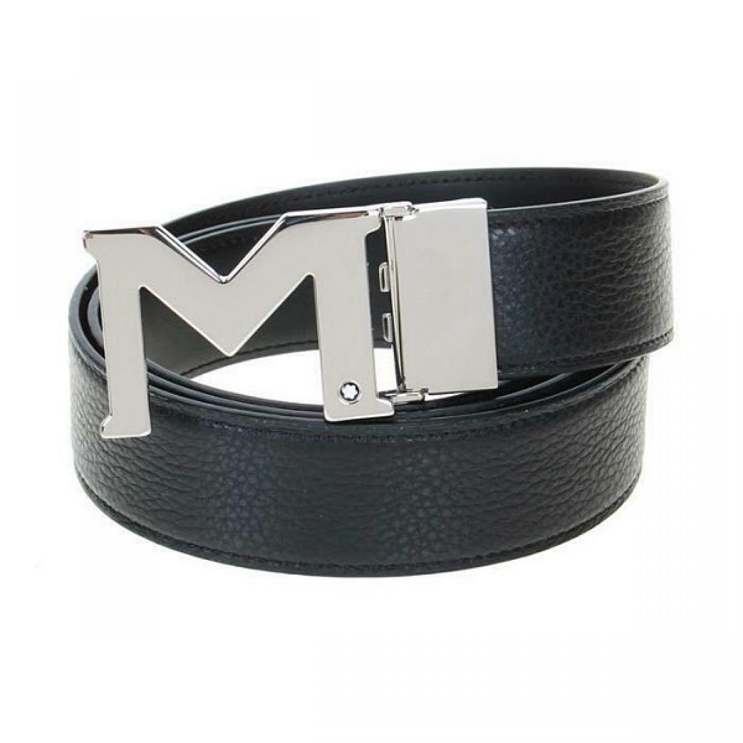 Palladium finish M buckle. Self-adjustable, 3.5 cm x 120 cm, reversible black grained and black plain leather strap for a sporty look.