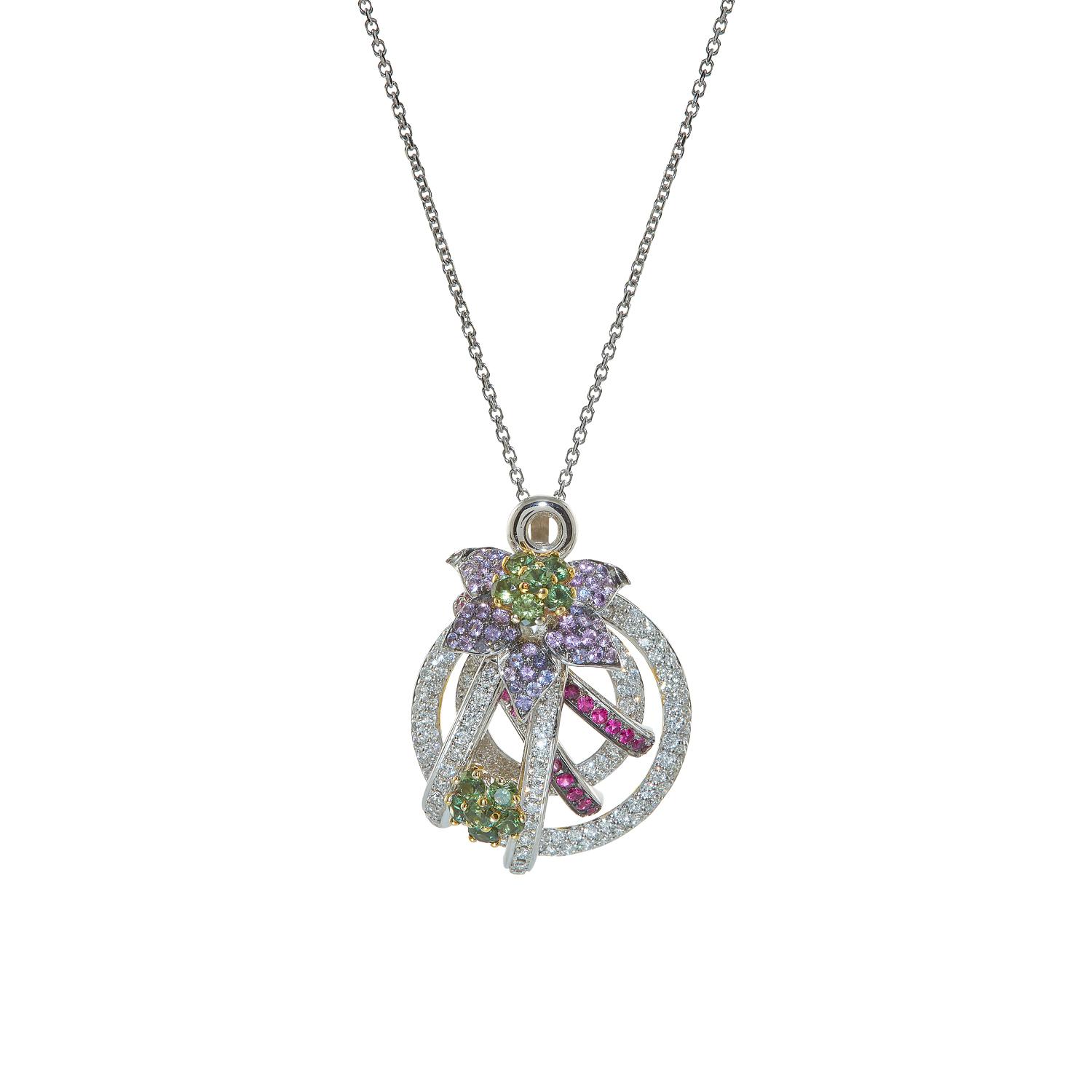 Tropical flowers pendant with diamonds, pink and green sapphires and amethyst.