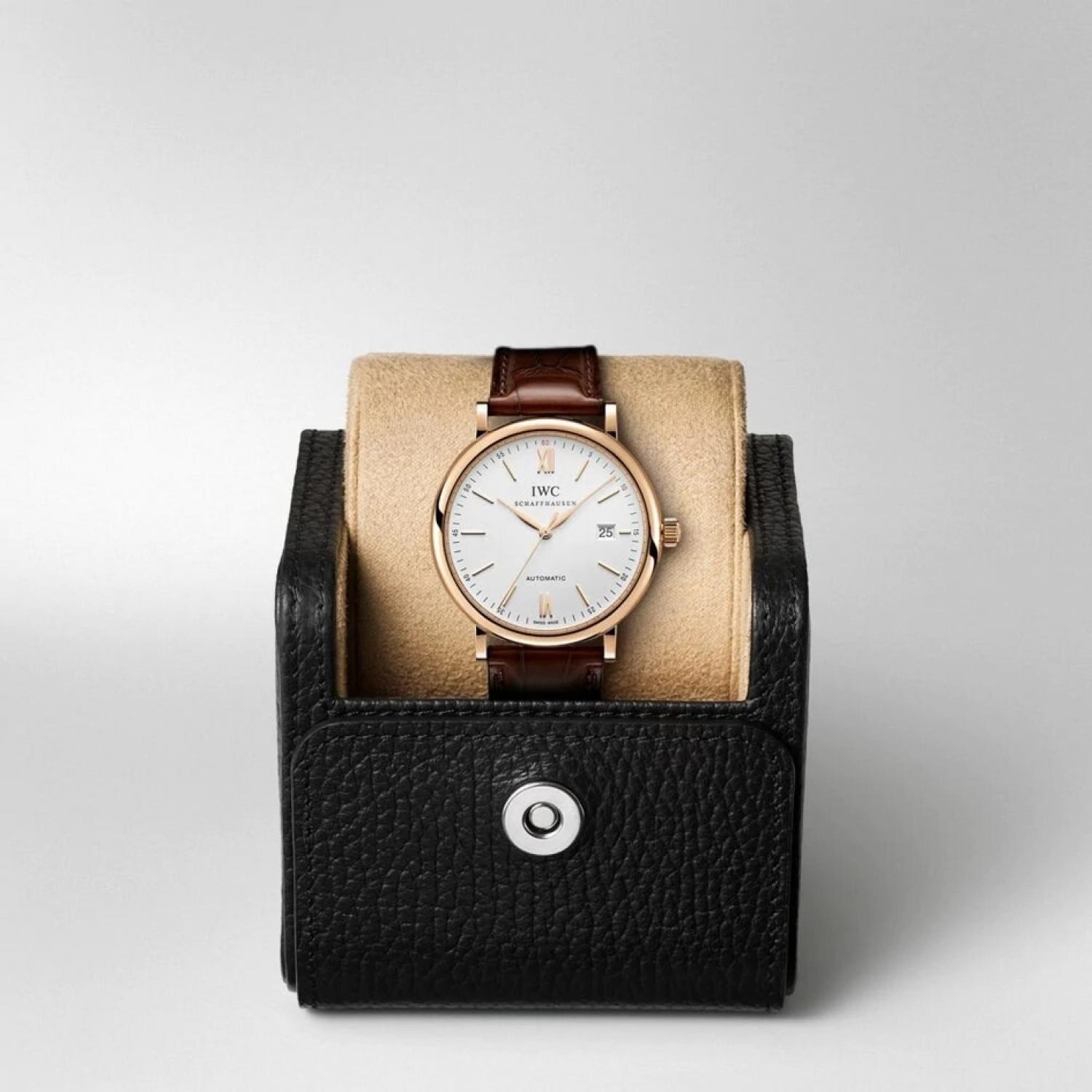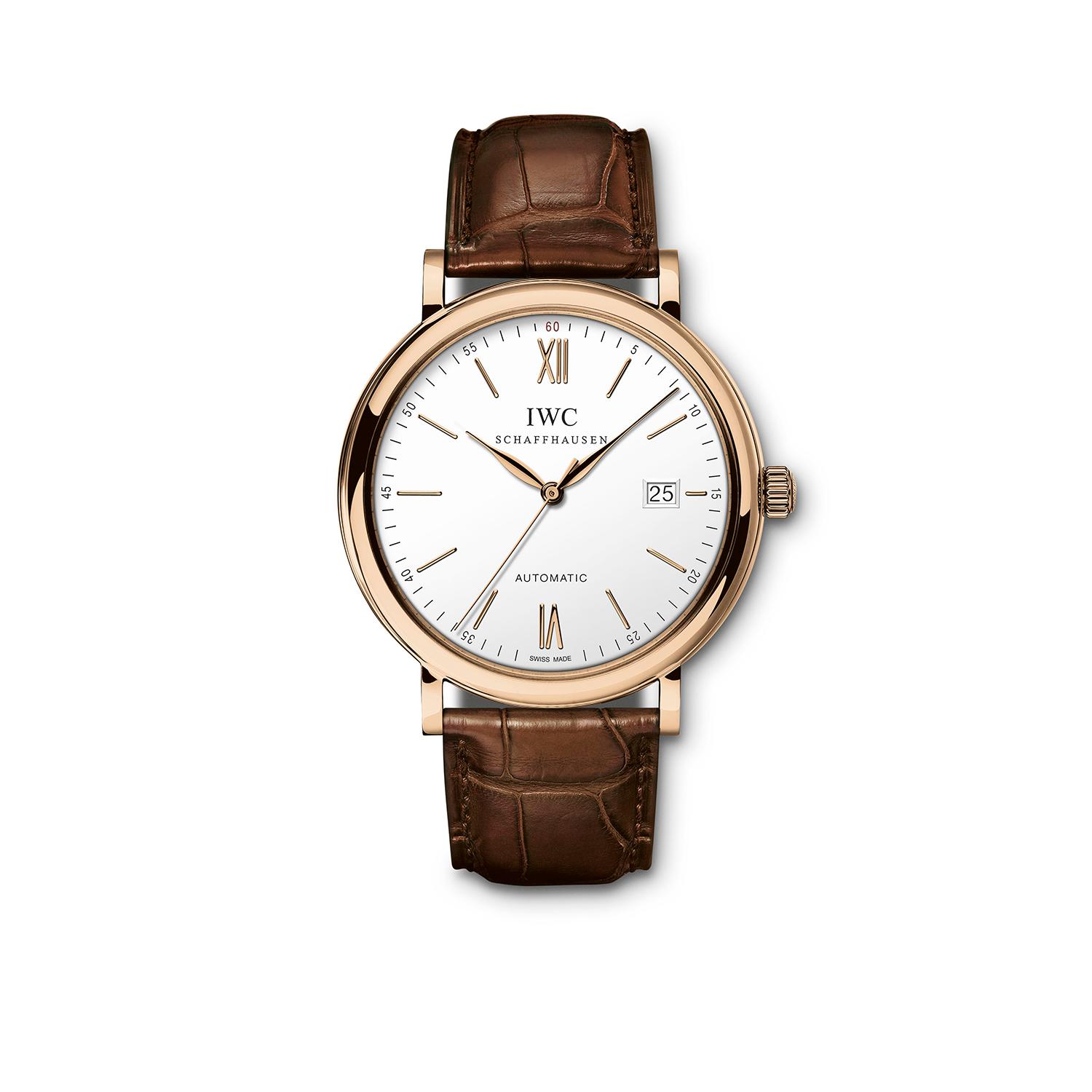 The 5N gold Portofino Automatic with a silver-plated dial and dark brown