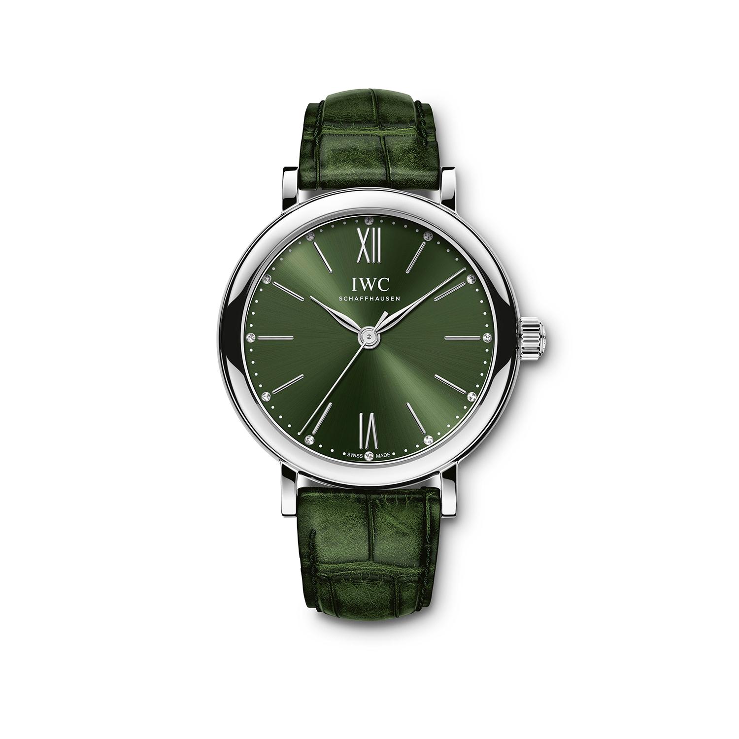 ladies' watch is fitted with a hand-painted green alligator leather