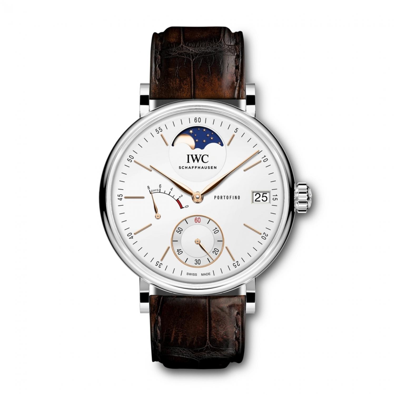 The Portofino Hand-Wound Moon Phase in stainless steel pays homage to